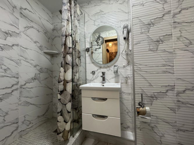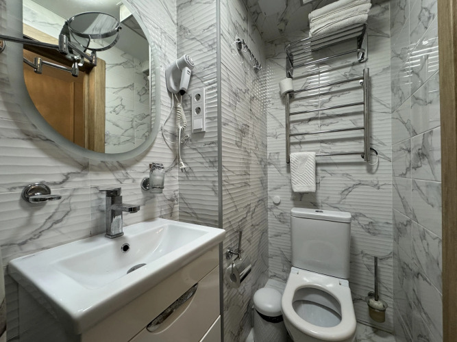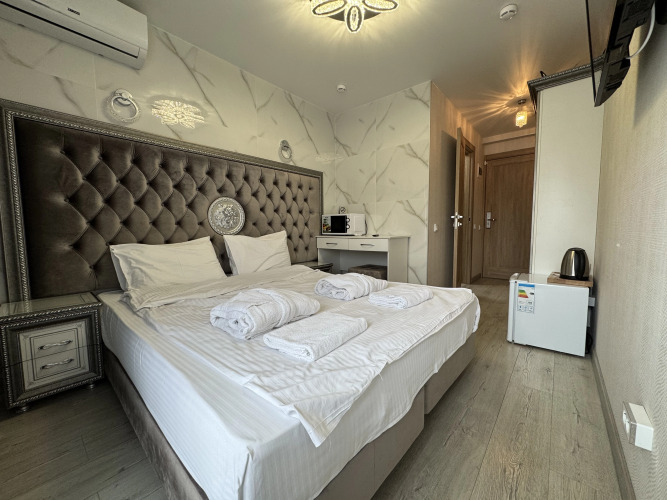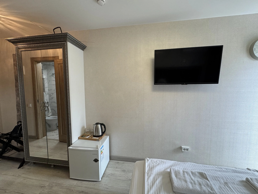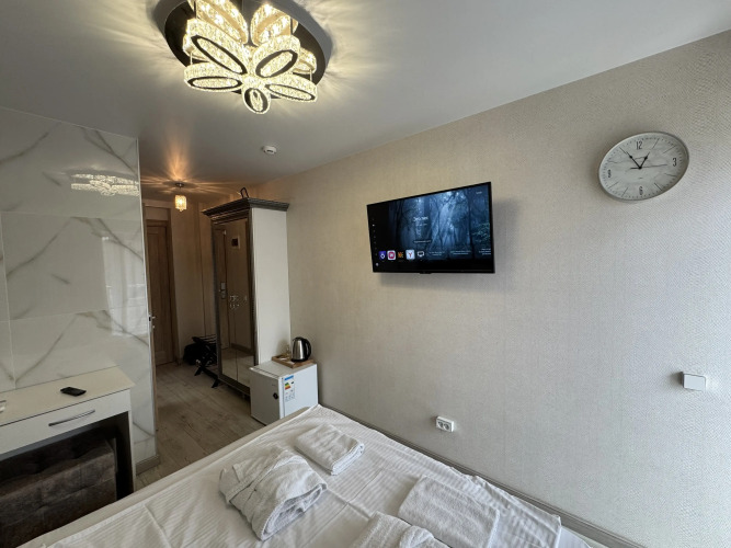 Номер уютно обставлен и оснащён необходимым, чтобы отдохнуть после долгого и насыщенного дня. Имеются телевизор и халат. Перечисленные услуги есть не во всех номерах.