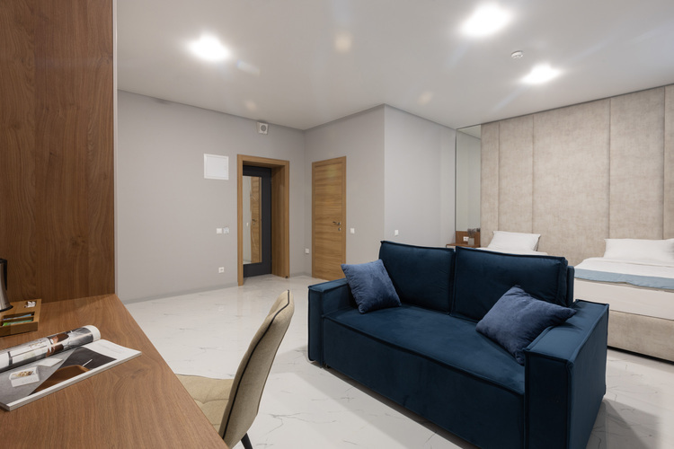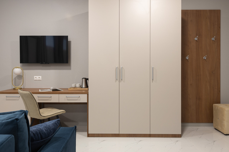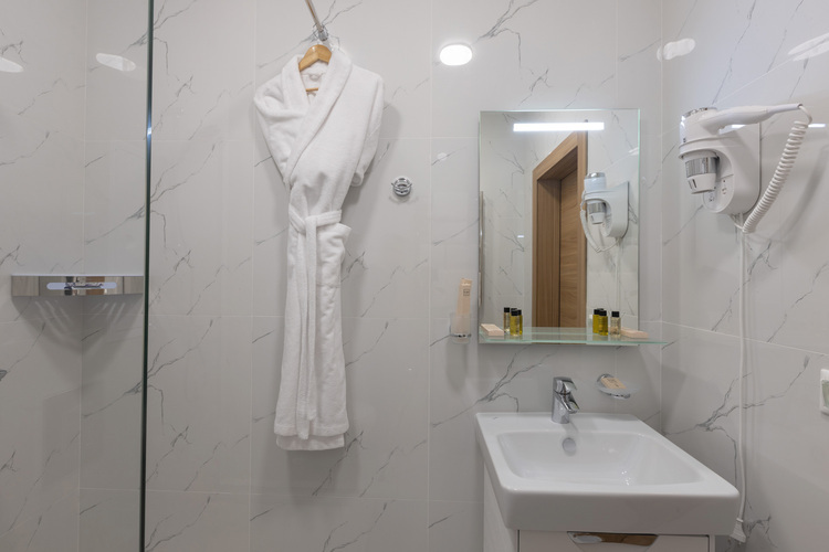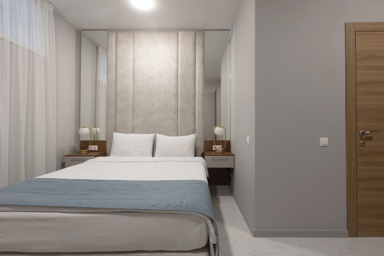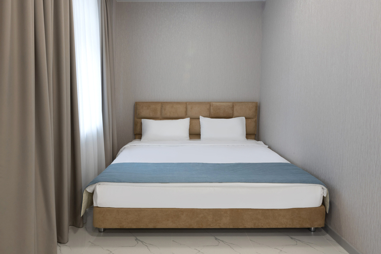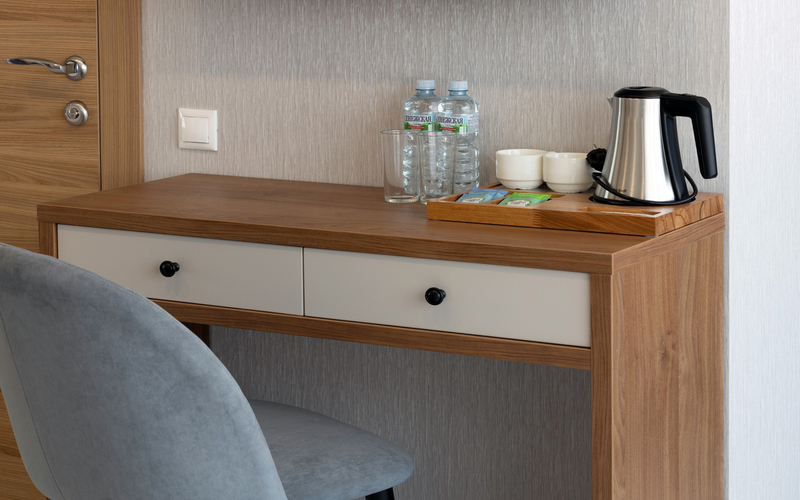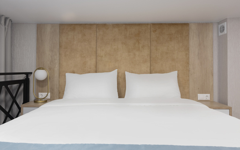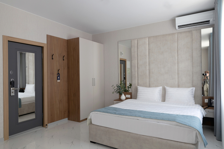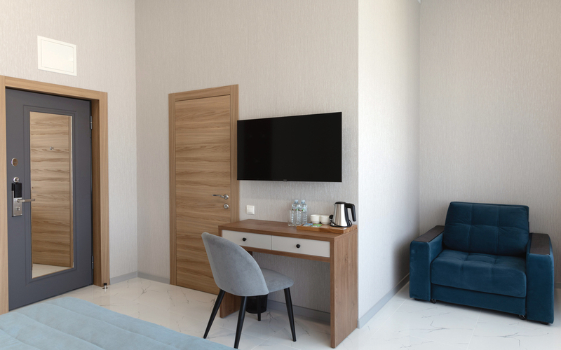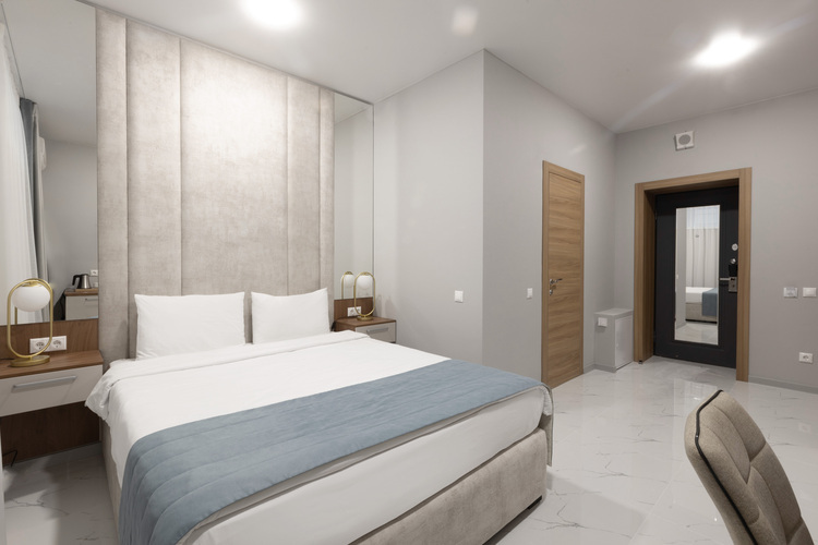 Однокомнатный номер площадью 18-24 м2, оборудованный всем необходимым для проживания. Двуспальная кровать с ортопедическим матрасом, сплит-система, места хранения вещей для эффективного использования пространства. В номере также имеются прикроватные тумбочки платяной шкаф, ТВ, стол, бесплатный Wi-Fi, телефон, индивидуальный сейф и чайная станция. Ванная комната полностью оснащена и вмещает душевую кабину, раковину, туалет, зеркало с подсветкой, фен, принадлежности для личной гигиены.