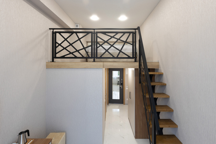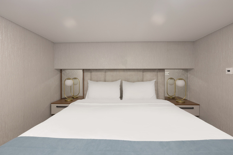 Это апартаменты, занимающие сразу два уровня (18 м2). На первом этаже расположена гостевая зона с раскладным диваном или креслом, плазменным телевизором, платяным шкафом, сейфом и чайной станцией. Спальня с двуспальной кроватью находится на втором этаже. Ванная комната полностью оборудована для комфортного пребывания: душевая кабина, раковина, туалет, фен, а также принадлежности для личной гигиены.
