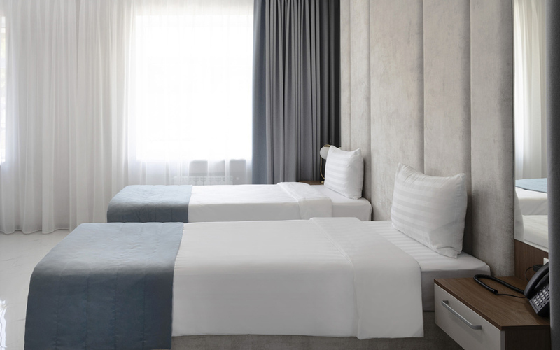 Номер площадью 19-25 м2. В номере есть 2 раздельные односпальные кровати, прикроватные тумбочки, шкаф для одежды, зона с телевизором, кондиционер, бесплатный Wi-Fi, телефон, индивидуальный сейф и чайная станция. В ванной комнате вы найдете все удобства: душевую кабину, раковину, туалет, зеркало с подсветкой, косметическое зеркало, фен, а также принадлежности для личной гигиены.