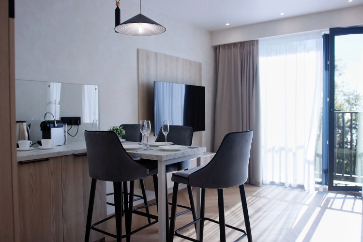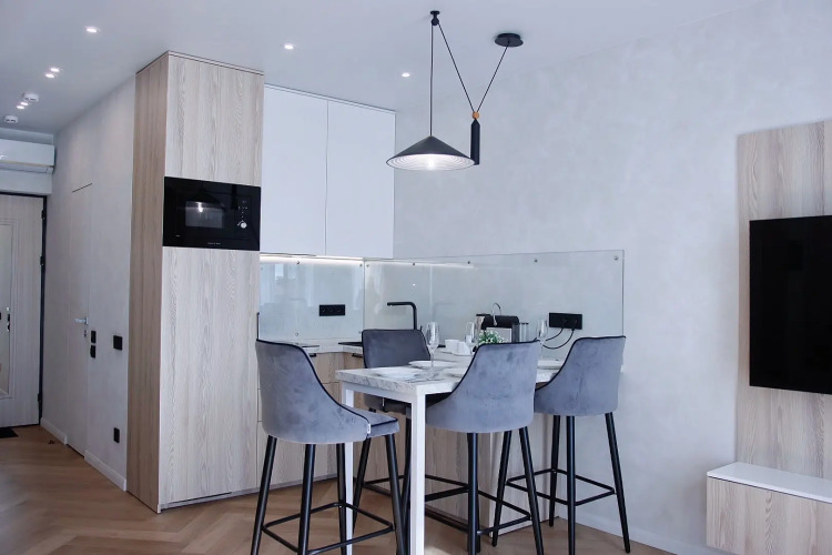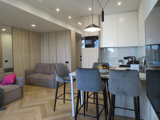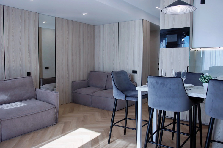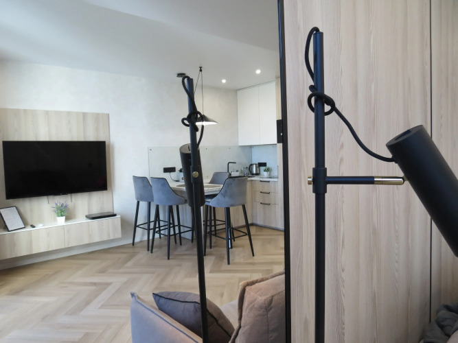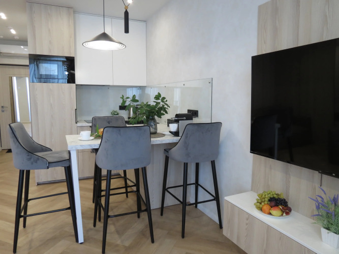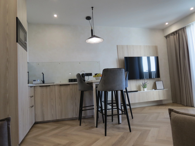 В распоряжении гостей есть: Wi-Fi, телевизор Smart TV, сплит-система, двуспальная кровать с ортопедическим матрасом 160х200 см, диван-кровать с ортопедическим матрасом, прикроватные тумбы, обеденный стол и стулья, гардеробный шкаф, постельное бельё, одноразовые тапочки, шампунь и гель для душа, зубная паста и щётка, санузел с душевым ограждением, стиральная машина, фен, утюг, гладильная доска, сушилка, набор махровых полотенец, жидкое мыло, средства гигиены. На кухне есть: холодильник, кофемашина, варочная поверхность, вытяжка, мойка, микроволновая печь, чайник, посуда, чай, кофе, сахар.