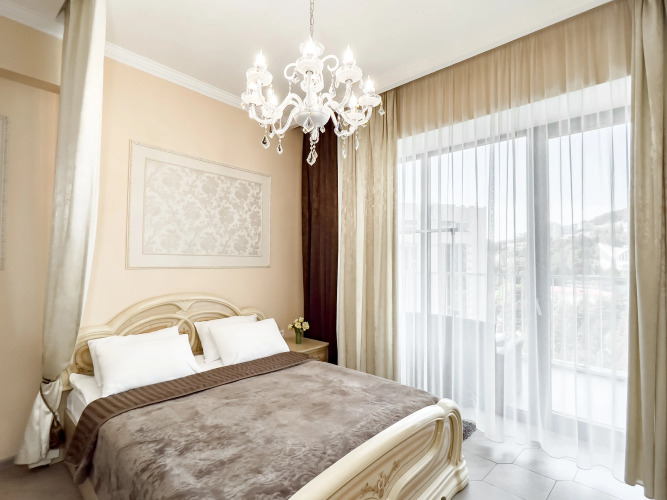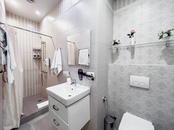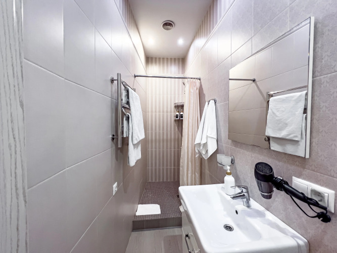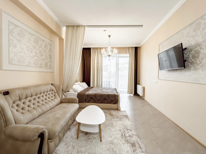 В номере вы найдёте телевизор. Оснащение зависит от выбранной категории номера.