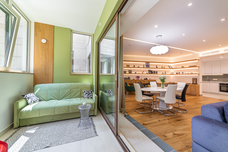 В распоряжении гостей гостиная, оснащённая широкоформатным телевизором. Гостиная совмещена с зоной библиотеки. Кухня оборудована современной техникой Neff.