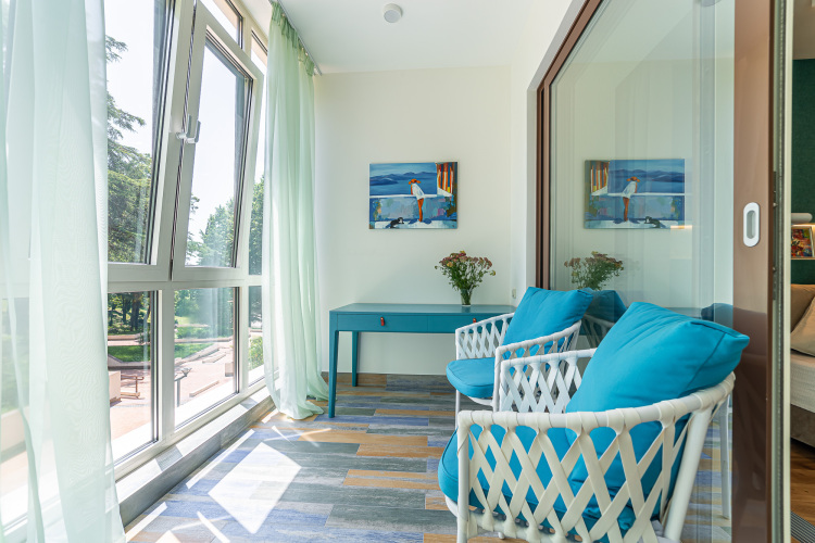Из гостиной есть выход на просторную застекленную лоджию, которая оформлена как комната отдыха, и может быть использована в качестве дополнительной спальни. Две спальни отделены коридором. Окна спален выходят на лоджию с панорамным видом на парк. В спальнях двухспальные кровати с ортопедическими матрасами и встроенные шкафы. Третья спальня небольшая без окна с диван-кроватью. В апартаментах 3 ванные комнаты. Все оборудованы душевыми. Есть принадлежности для стирки и глажки, индивидуальные косметические принадлежности. По запросу предоставляется детская кроватка и детский обеденный стульчик, а также игрушки для детей.