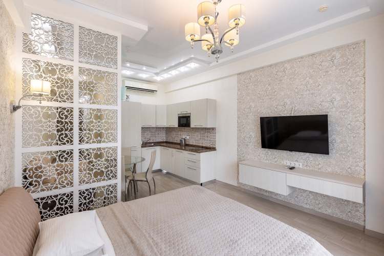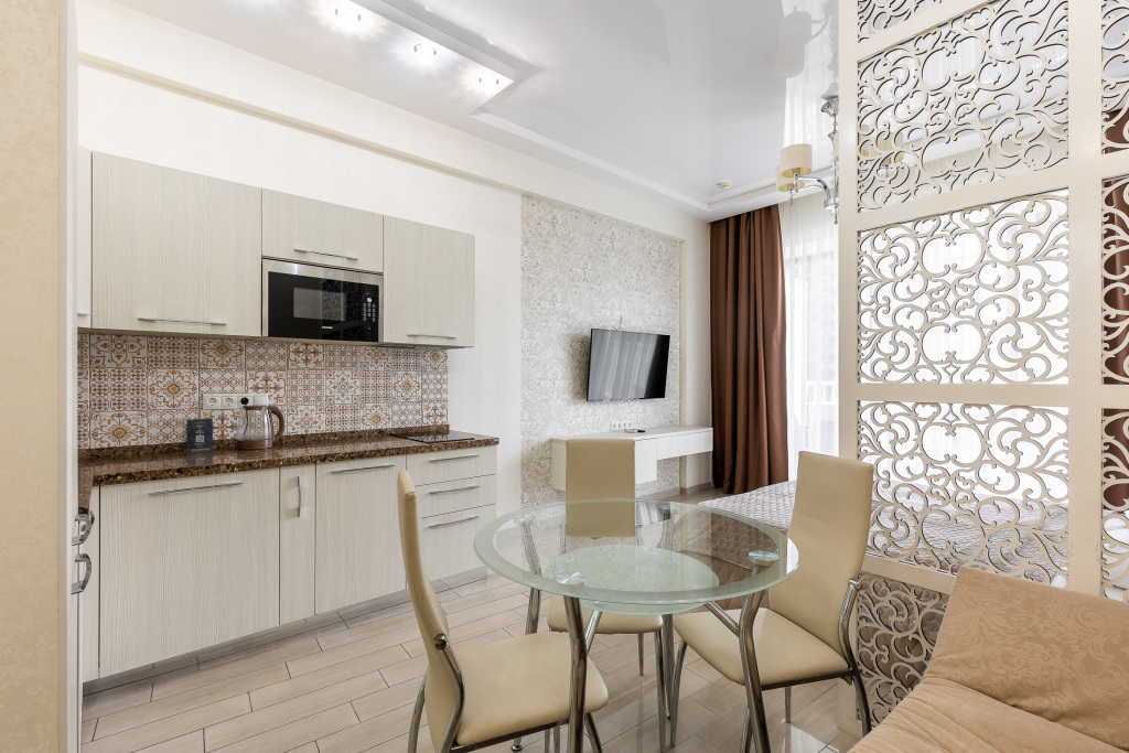 В номере вы найдёте телевизор. Оснащение зависит от выбранной категории номера.