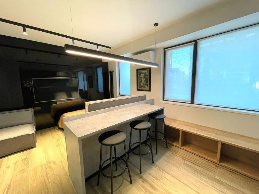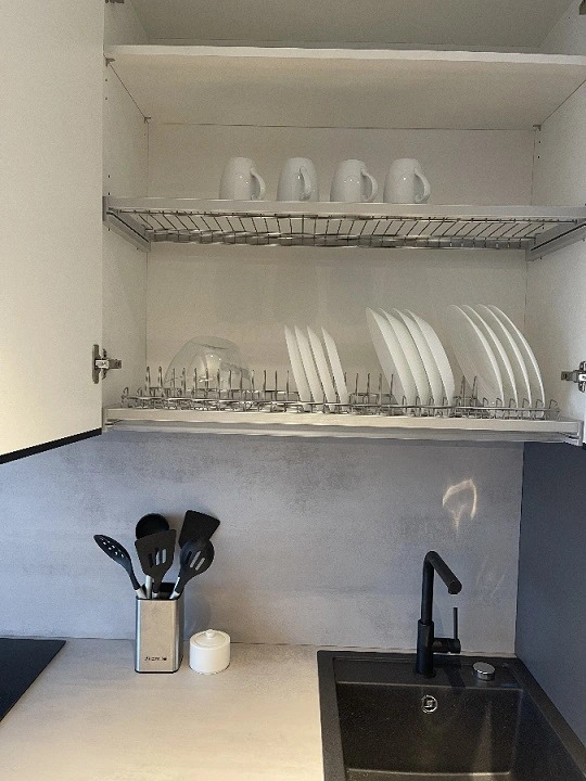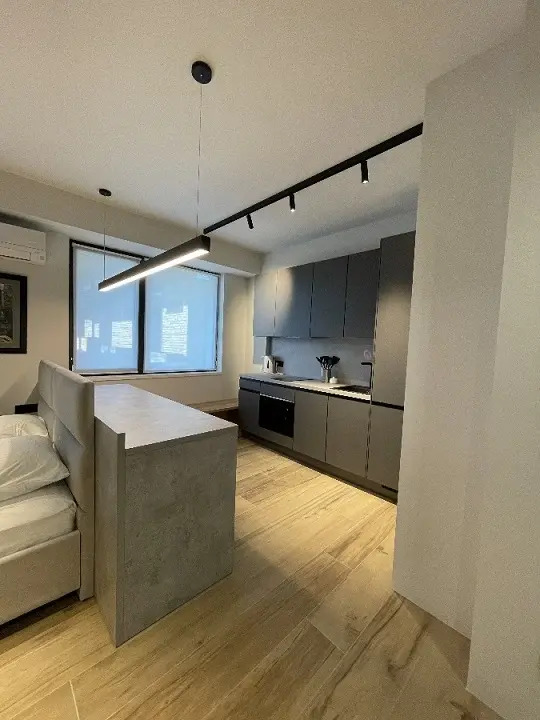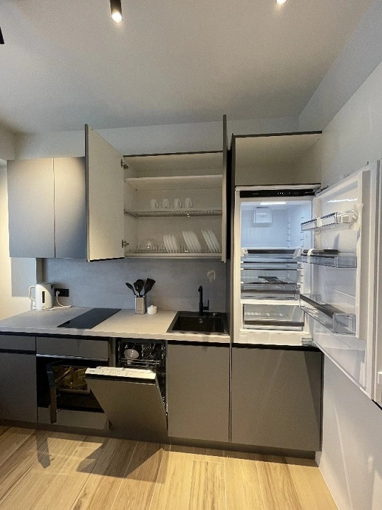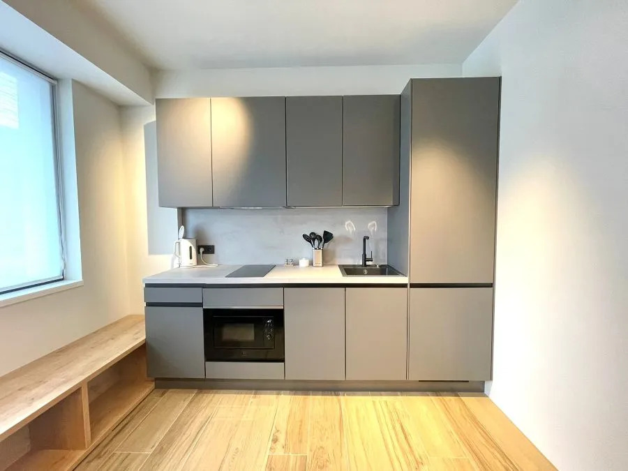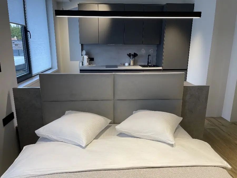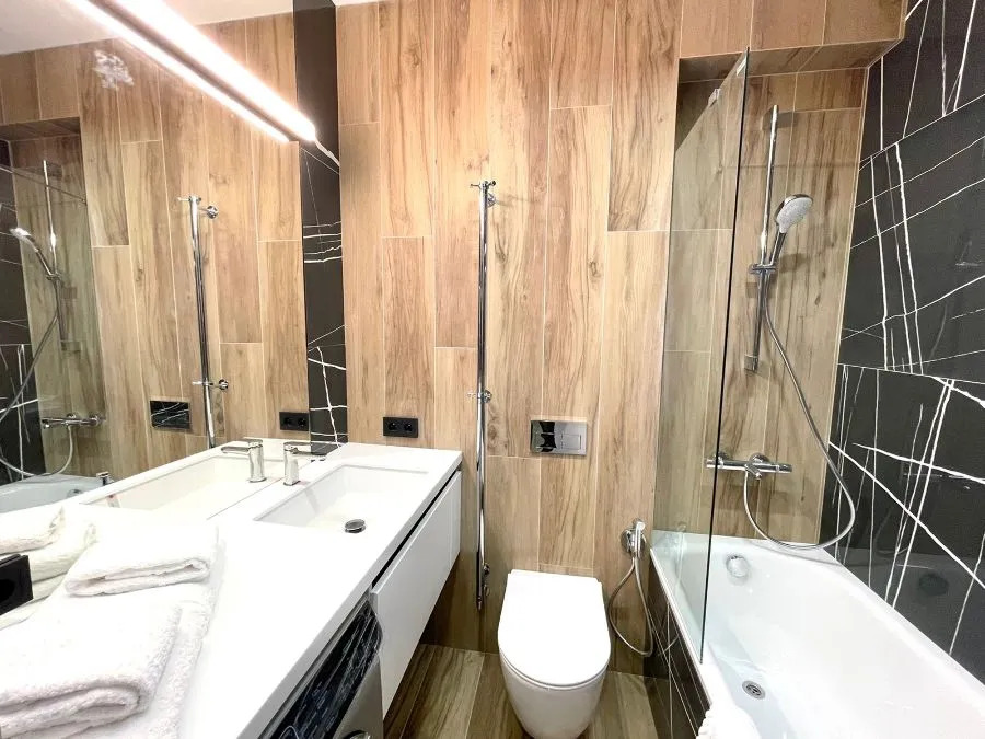 Студия площадью 30 кв. м. с дизайнерским ремонтом имеет необходимое для для комфортного проживания: двуспальная кровать с ортопедическим матрасом, раскладывающееся кресло-кровать, кондиционер, холодильник, стиральная и посудомоечная машины, микроволновая печь, телевизор, электрический чайник и фен. Также предоставляются комплект посуды, утюг с гладильной доской, постельное бельё и полотенца, сушилка для белья. В санузле есть ванна.