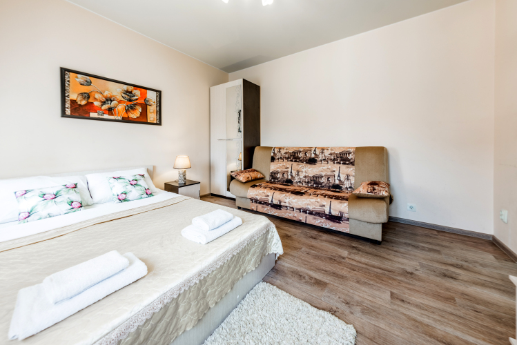 Двуспальная кровать и двуспальный диван, кондиционер, Wi-Fi, телевизор с цифровыми каналами, сейф, гладильное оборудование. Установлен кухонный гарнитур с газовой плитой, микроволновой печью и холодильником. Ванная комната укомплектована душем, стиральной машиной и феном.