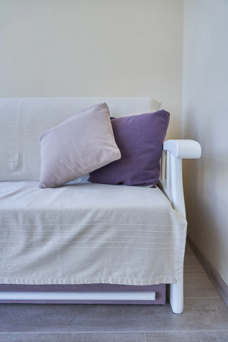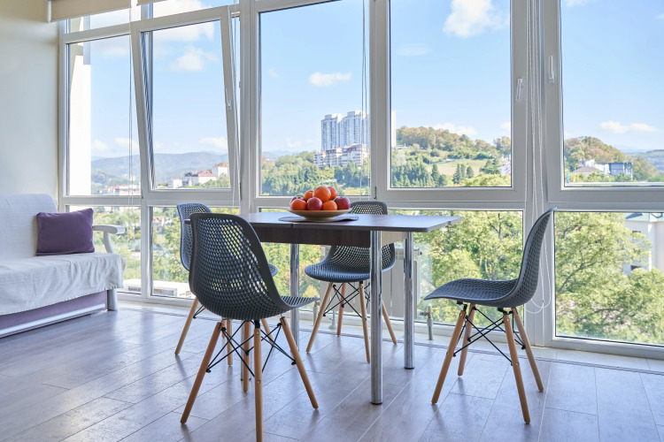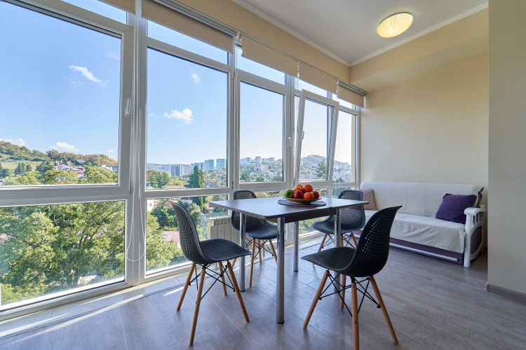 Апартаменты вмещают до 4 взрослых и 2 детей (с доплатой). В гостиной установлены двуспальная кровать 160×200 см и два дивана-кровати 140×200 см. Из панорамных окон открывается вид на лес и горы. Балкона нет.