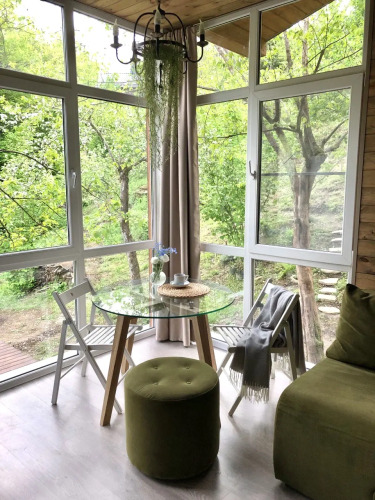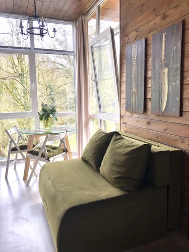 Кухня-гостиная с раскладным диваном 110х200 см, видом на террасу и речку. Утром в солнечный день кухня полностью наполняется солнечным светом.