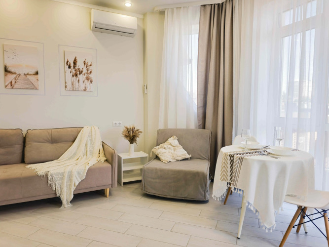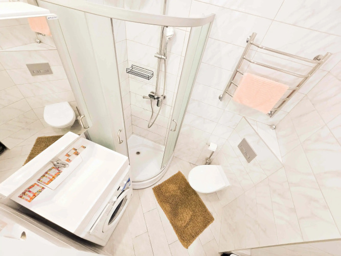 Квартира с двуспальным диваном и раскладным одноместным диваном для 3-х человек. В наличии оборудованная кухня для самостоятельного приготовления пищи. Есть душевая комната со стиральной машинкой и феном. В наличии телевизор со Smart-TV и балкон для отдыха.