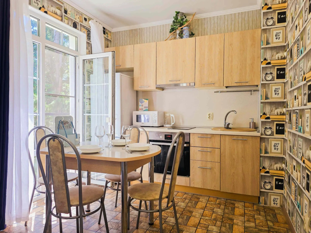 Студия полностью укомплектована бытовой техникой для комфортного проживания: имеется плита, кондиционер, набор посуды, холодильник, утюг, гладильная доска, стиральная машина, фен, высокоскоростной интернет Wi-Fi, ТВ, гостям предоставляются косметические наборы и тапочки. Из апартаментов открывается вид на тихую улицу. Имеются парковочные места для автомобилей.