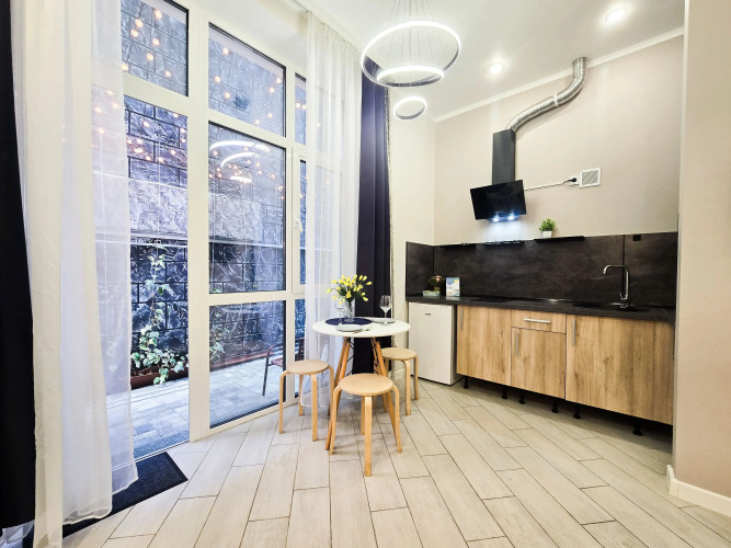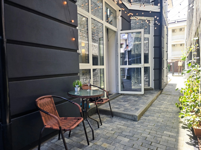 Гостиница Квартира Стильная студия для 3х человек с кроватями и зоной отдыха на улице