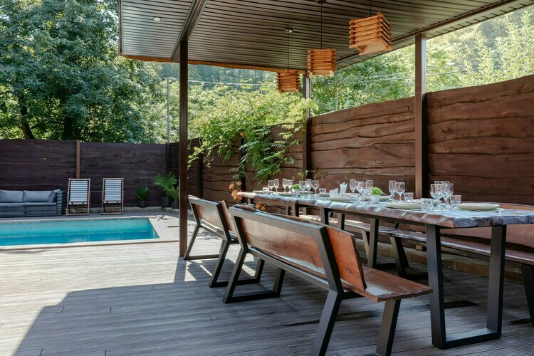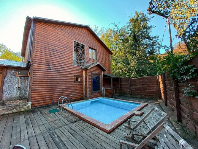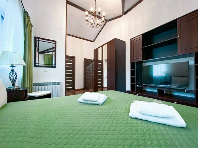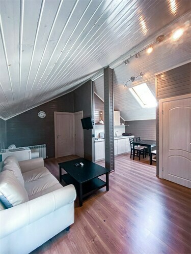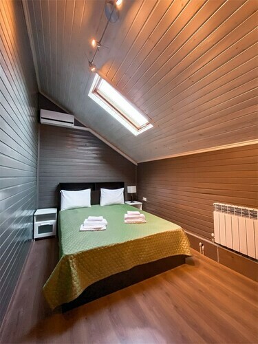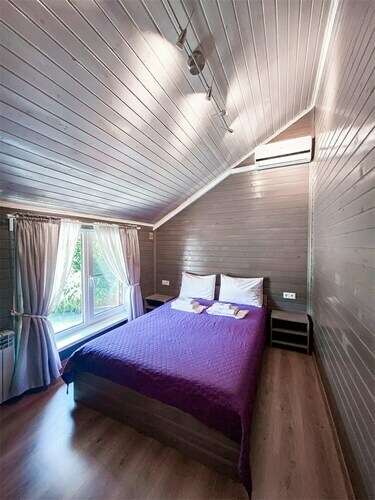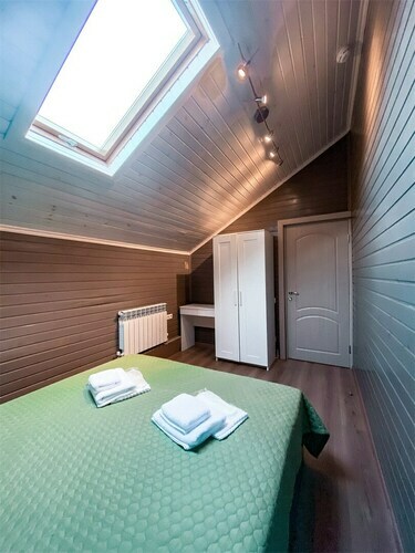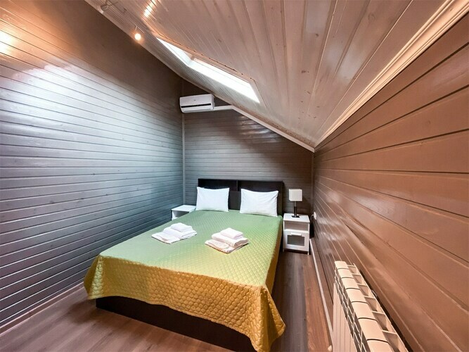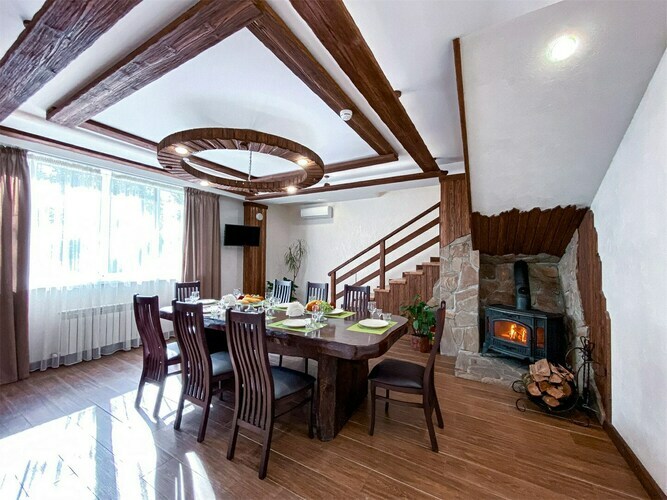 Коттедж идеально подойдёт для большой компании. В вашем распоряжении будет русская баня с бассейном, каминный зал с обеденным столом, кухня, открытая терраса с шезлонгами, 3 спальни и большой балкон с видом на реку. Предоставляется 2 часа русской бани ежедневно. Вязанка дров для камина. Мангал, набор шампуров и решетка для гриля.