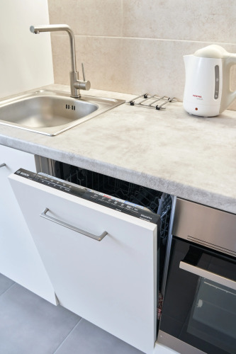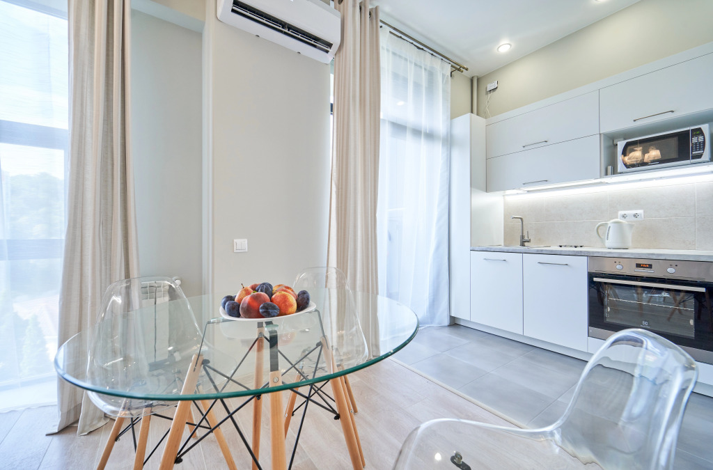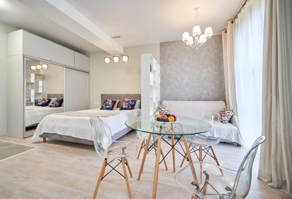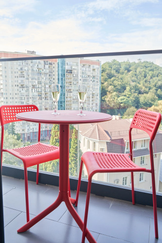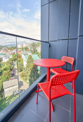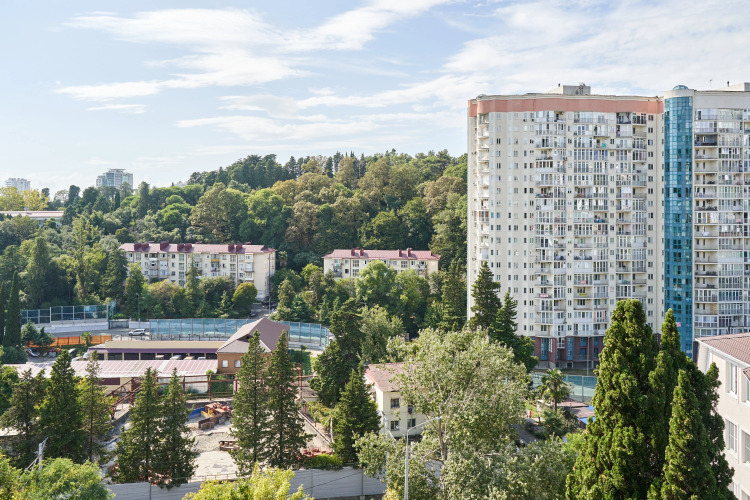 В апартаментах установлены двуспальная кровать 160x200 см и раскладной диван 160x200 см, также есть телевизор Smart TV и Wi-Fi. С балкона открывается вид на город и дендрарий.