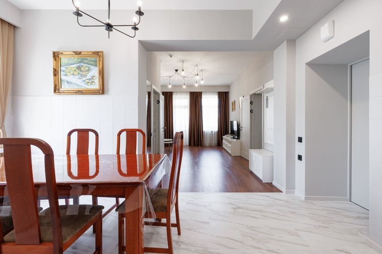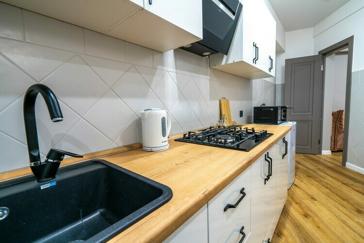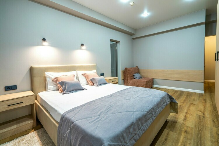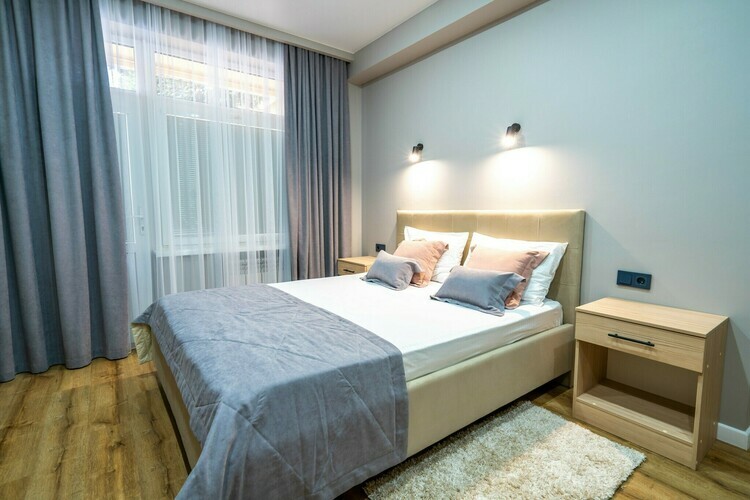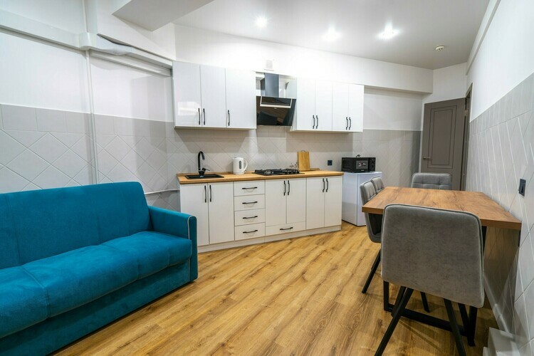 Апартаменты состоят из двух раздельных комнат — спален. Просторная гостиная с кухонной и обеденной зоной. Большой балкон с уличной мебелью. Один санузел с ванной, имеется фен. К вашим услугам: газовая плита, духовой шкаф, вытяжка, микроволновая печь, встроенный аквафильтр для воды, стиральная машина, утюг/гладильная доска. Здесь же имеется вся кухонная утварь: Посуда, чашки, столовых приборов, бокалы, кастрюли, сковородки и многое другое. В номере могут размещаться до 7 человек.