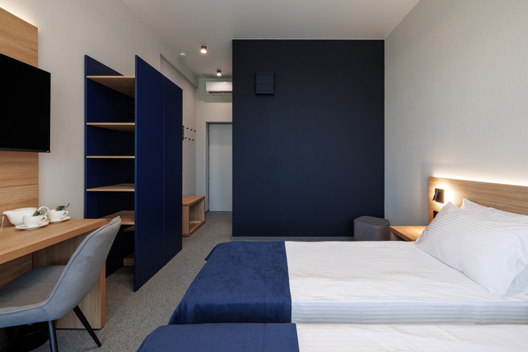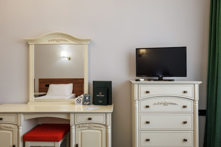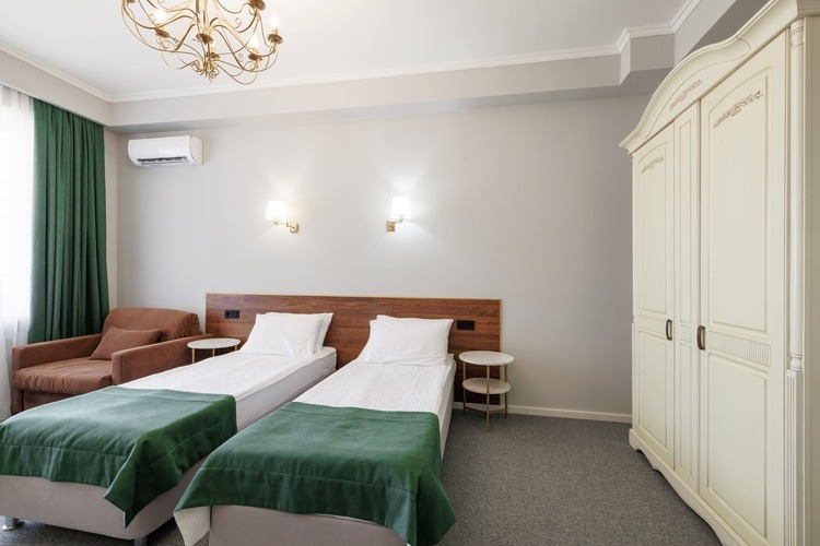 Небольшой номер площадью 13 кв.м с одной общей или двумя раздельными кроватями (при необходимости соединяем вместе). В номерах есть телефон, кондиционер, телевизор, мини — холодильник. В санузле есть душ, фен, комплект для индивидуального пользования, набор полотенец.Максимальное количество гостей в номере составляет 3 человека. Стоимость номера включает проживание двоих гостей (включая питание согласно выбранного тарифа), третий гость размещается за дополнительную плату на дополнительном месте.