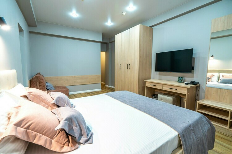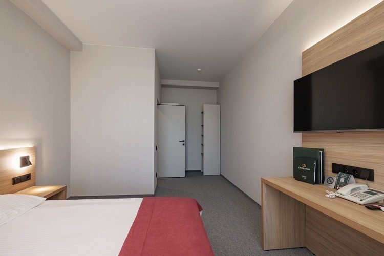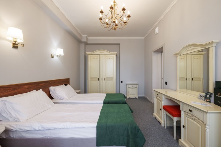 Для любителей комфорта в первом корпусе отеля предоставлены стандартные двухкомнатные номера c просторным балконом. Двухкомнатный номер включает спальную комнату и комнату отдыха — гостиную. Комнаты не смежные. Площадь данного номера составляет от 35 кв.м. В спальной комнате широкая французская кровать, 2-мя прикроватные тумбы, платяной шкаф, стол, стулья, пуфик, телефон, телевизор, кондиционер. В гостиной – мягкая мебель: раскладные диван и кресло, журнальный столик, телефон, телевизор, стол, с