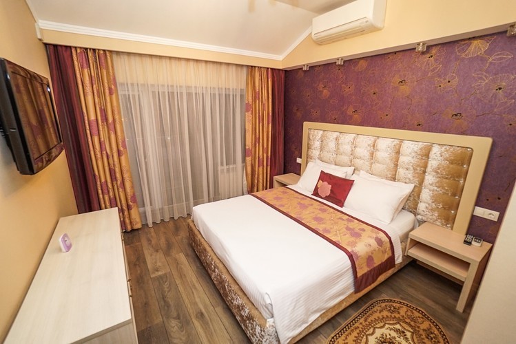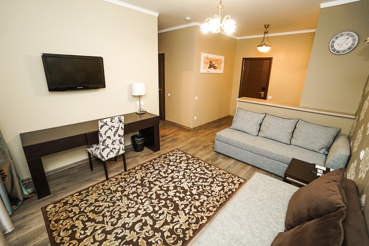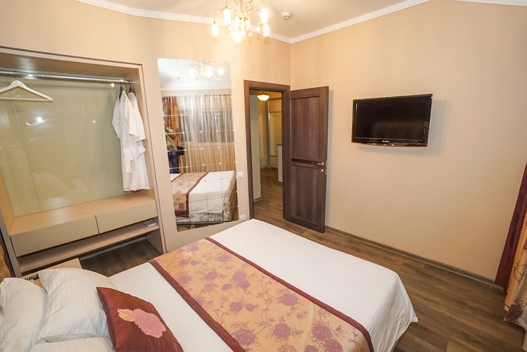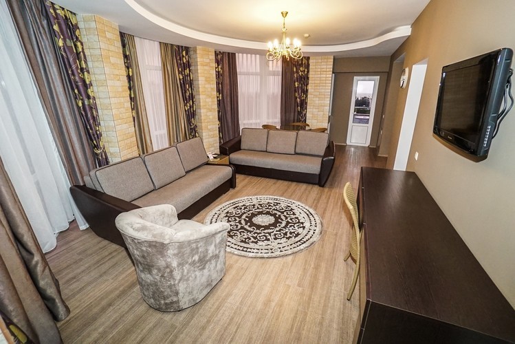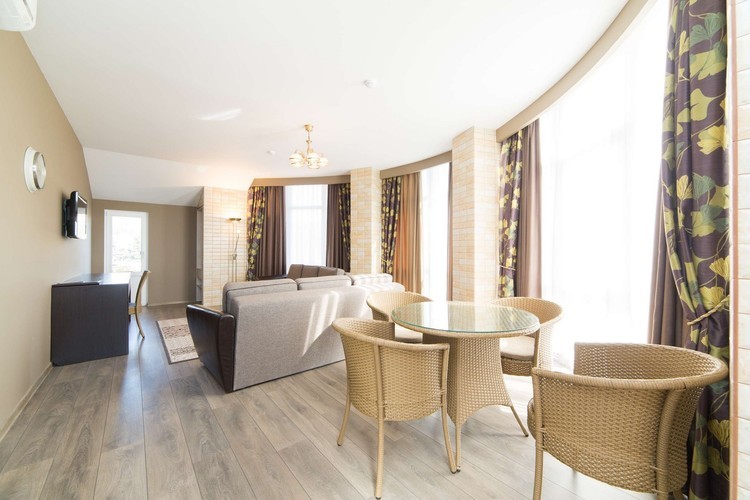 Светлый номер класса люкс с гостиной и спальней. Оборудован всем необходимым для комфортного отдыха: TV плазма и кондиционер в каждой комнате, удобное зонирование, достойный интерьер, дополненный картинами и коврами, создающими атмосферу уюта. Номера с видом на горы и прогулочный парк.