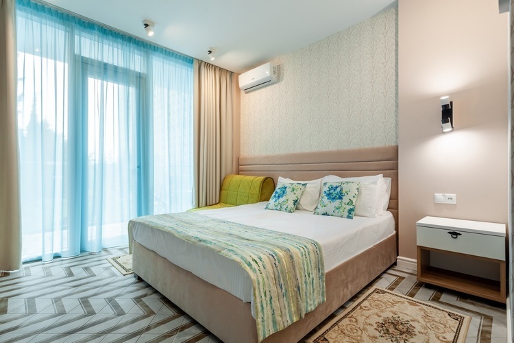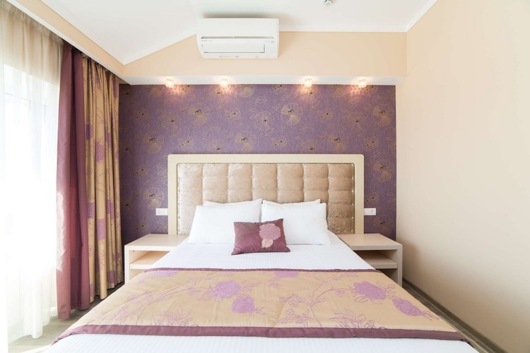 Светлый номер класса люкс с гостиной и спальней. Оборудован всем необходимым для комфортного отдыха: TV плазма и кондиционер в каждой комнате, удобное зонирование, достойный интерьер, дополненный картинами и коврами, создающими атмосферу уюта. Номера с видом на море и прогулочный парк.