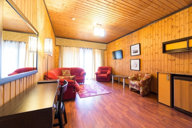 Просторный двухкомнатный номер с гостиной и спальней. Оборудован всем необходимым для комфортного отдыха: TV плазма и кондиционер в каждой комнате, гладильная доска и утюг, удобное зонирование, достойный интерьер. Стены, украшенные картинами, и мягкие ковры дополняют атмосферу древесного уюта. Номера с видом на внутренний дворик.