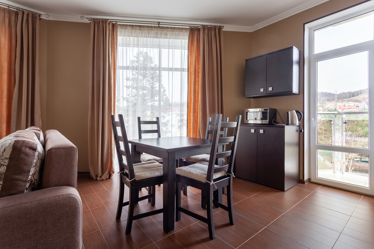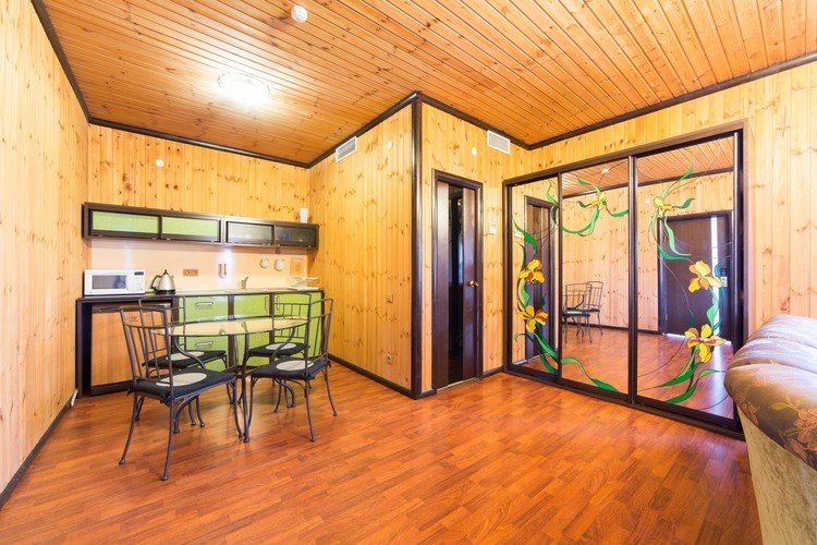 Номер Студио – для тех, кто ценит домашний уют даже на отдыхе. Просторный двухкомнатный номер с гостиной и спальней, оборудован встроенной кухней. Мы постарались учесть все, что может пригодиться нашим гостям для комфортного отдыха: TV плазма и кондиционер в каждой комнате, стиральная машина, обеденный стол со стульями, микроволновая печь, полный комплект посуды. Номера с видом на внутренний дворик или лесопарковую зону.