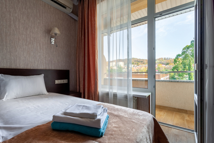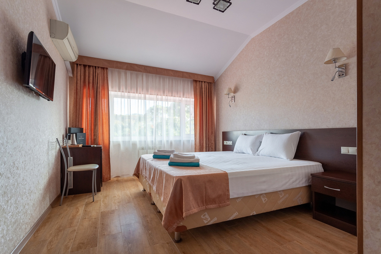 Однокомнатный номер, рассчитанный на два основных места. В комнате предусмотрено наличие либо одной двуспальной, либо двух односпальных кроватей. Имеется дополнительное место – кресло-кровать. Индивидуальный балкон. Номер оборудован всем необходимым для комфортного отдыха. Номера с видом на горы, парк, внутренний дворик.