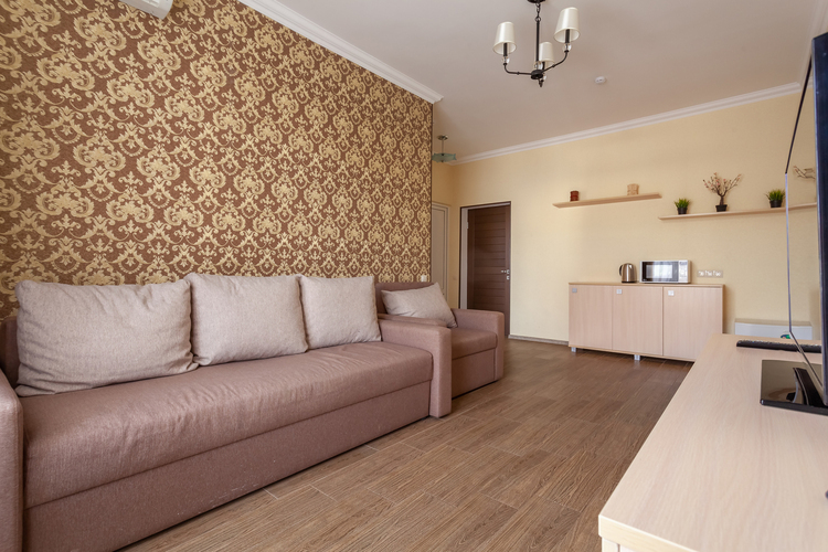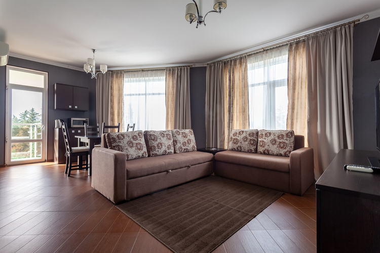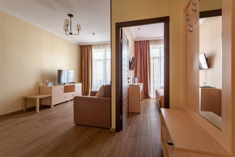 Светлый люкс 40 кв.м. с гостиной и спальней. В номере 2 основных и 3 дополнительных места – диван и диван-кровать - которые оплачиваются отдельно, в зависимости от сезона и тарифа.