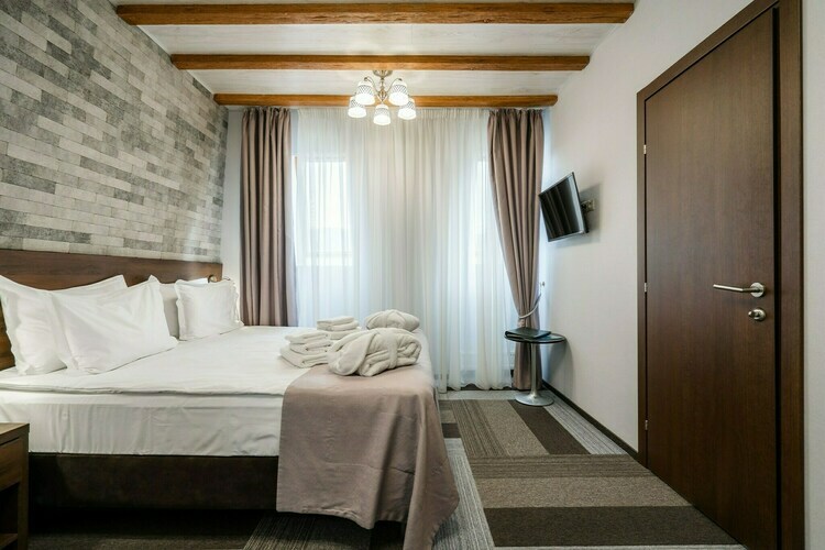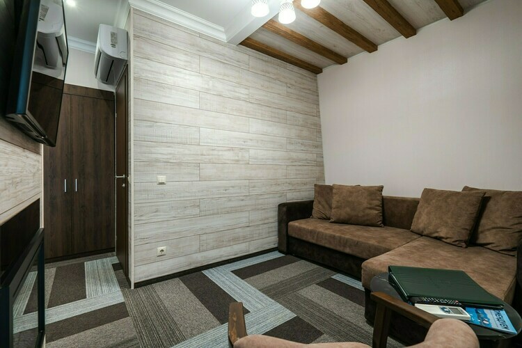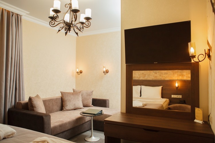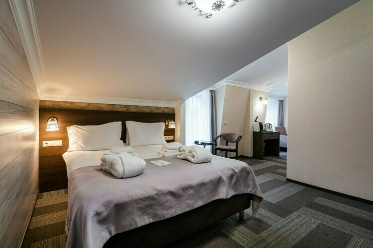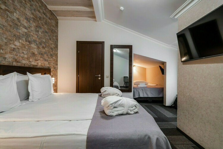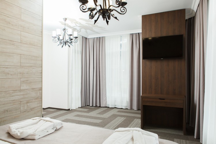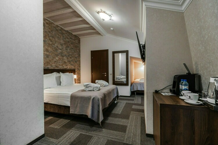 Делюкс – это просторный светлый двухкомнатный номер категории премиум с великолепным видом на горы. В каждой из комнат номера наши дизайнеры создали эстетически безупречный интерьер, выдержанный в спокойных, мягких тонах. Удобная двуспальная кровать подарит Вам мирный и здоровый сон. Предусмотрены и четыре дополнительных спальных места. В номере есть всё для безмятежного отдыха: кондиционер, плазменные телевизоры, бесплатный Wi-Fi, холодильник и микроволновая печь, обеденный