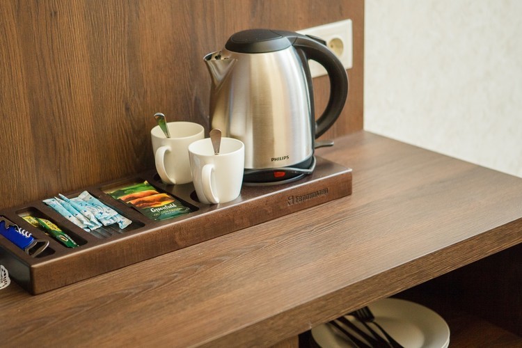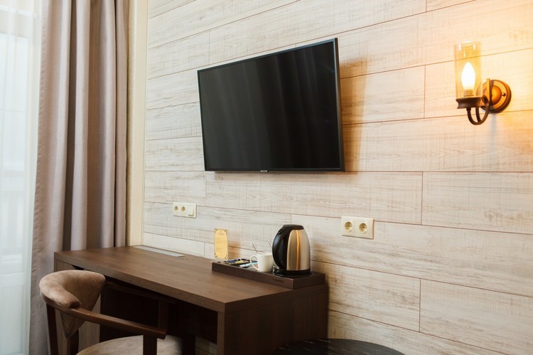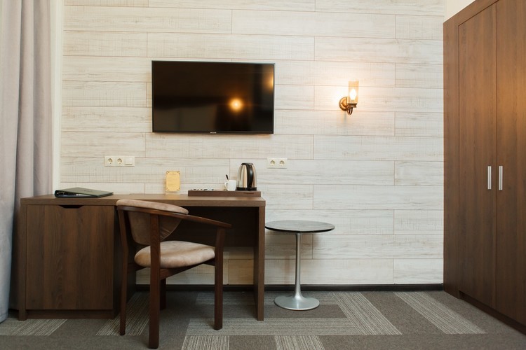 Номер класса «Стандарт» – это по-домашнему уютный однокомнатный номер с панорамными окнами. Дизайн номера выдержан в спокойных, теплых тонах. В номере расположена двуспальная кровать с мягким матрасом, кроме того, есть два дополнительных удобных спальных места. Напротив кровати размещен плазменный телевизор. В номере предусмотрено всё необходимое для Вашего комфортного проживания: холодильник, кондиционер, утюг и гладильная доска, чайный уголок, сейф, удобная мебель, в том числе диван, столы, ст