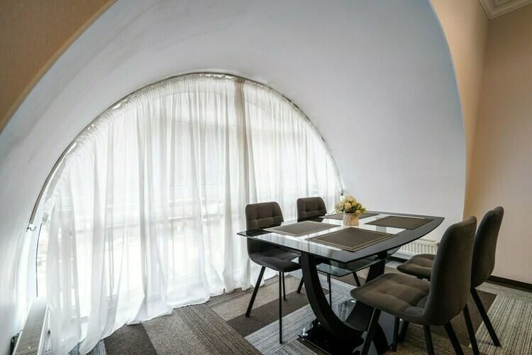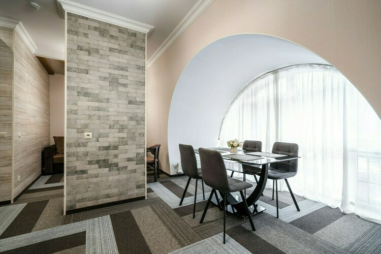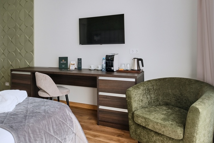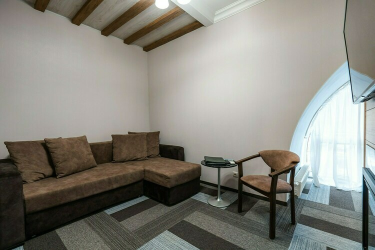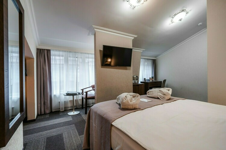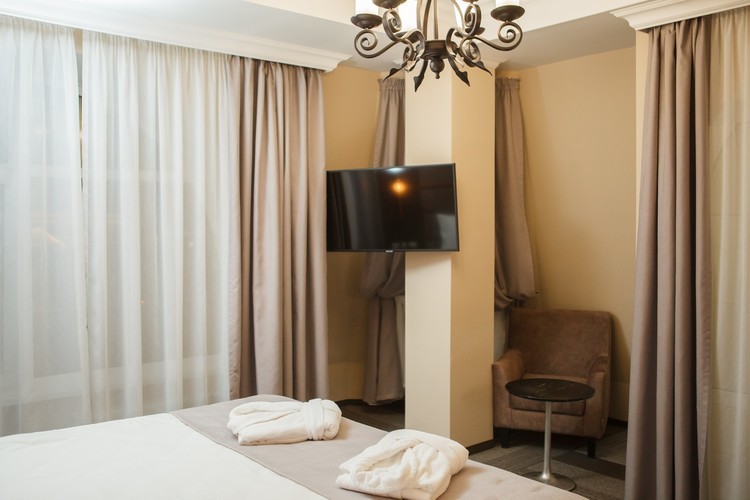Номер класса «Стандарт с балконом» – красиво обставленный, уютный однокомнатный номер с панорамными окнами, в котором каждый наш гость сможет расслабиться и почувствовать себя как дома. Отличительной особенностью номера является наличие балкона, выходящего во внутренний двор отеля. В номере созданы все условия для комфортного проживания – это мягкая двуспальная кровать и дополнительные спальные места, удобный диван с журнальным столом, шкаф, туалетный столик, стулья. Разумеется, предусмотрен кон