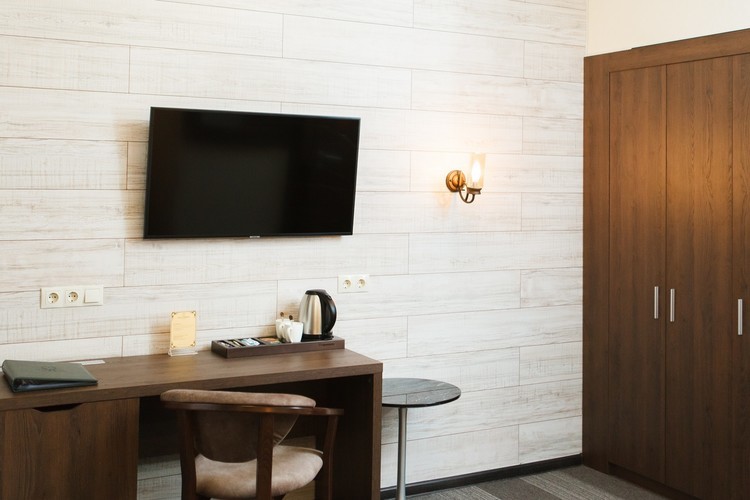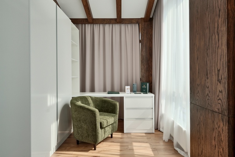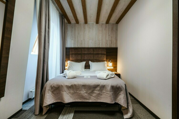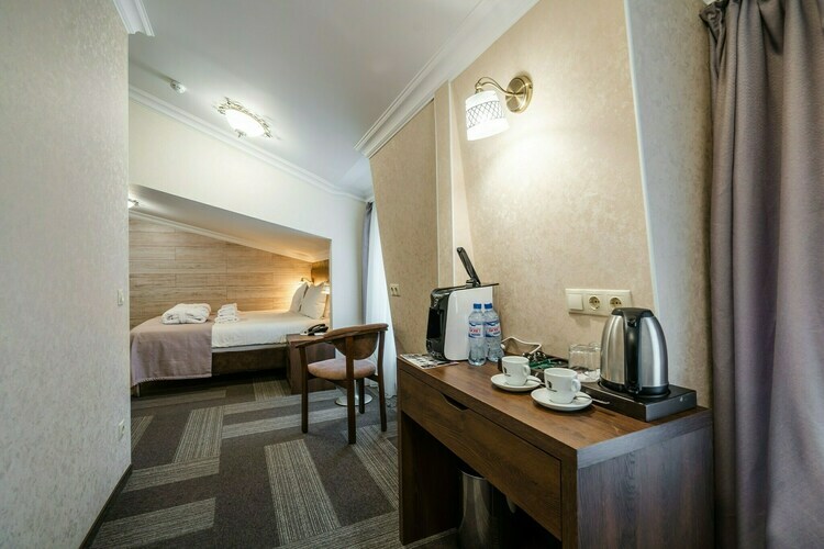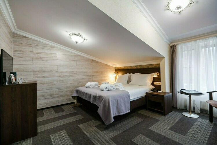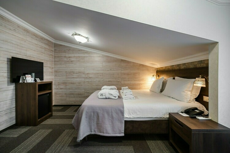 Номер класса «Стандарт Мансарда» – это однокомнатный номер расположенный на мансардном этаже. Дизайн номера выдержан в спокойных, теплых тонах. В номере предусмотрено всё необходимое для Вашего комфортного отдыха. Так же в номере установлена умная станция "Алиса". Проживание 1 ребенка до 4-х лет без предоставления места бесплатно.