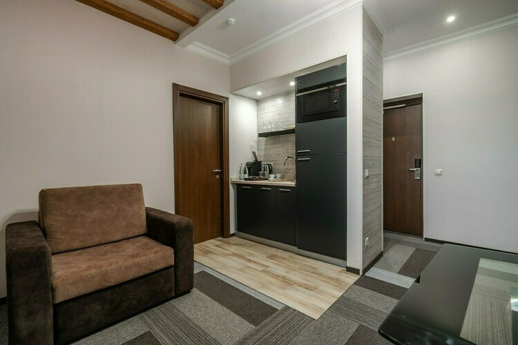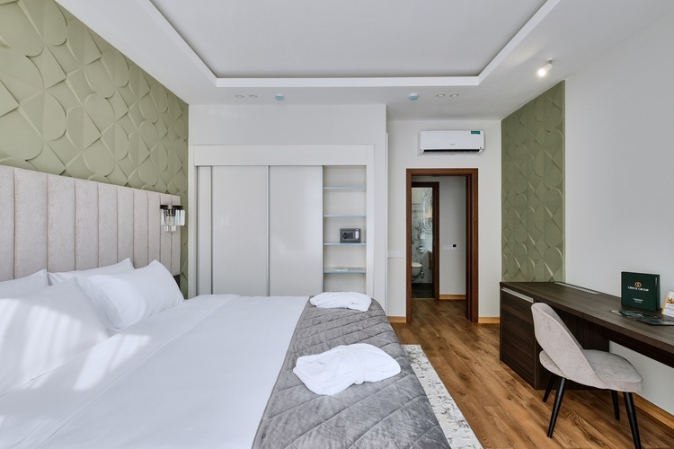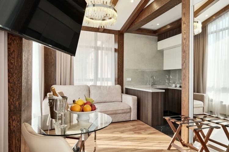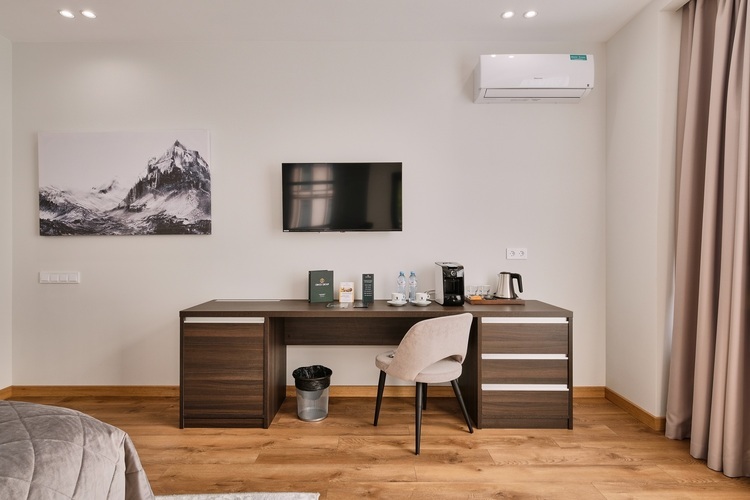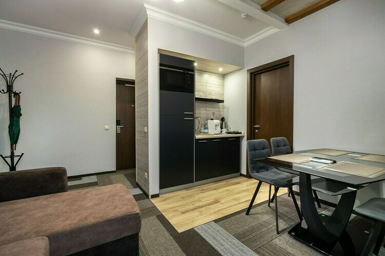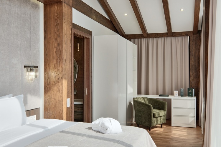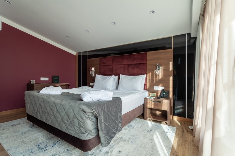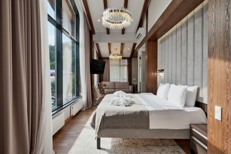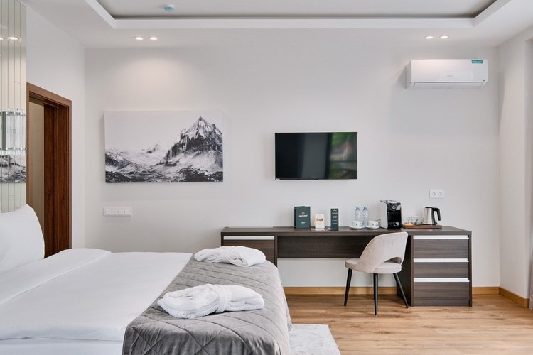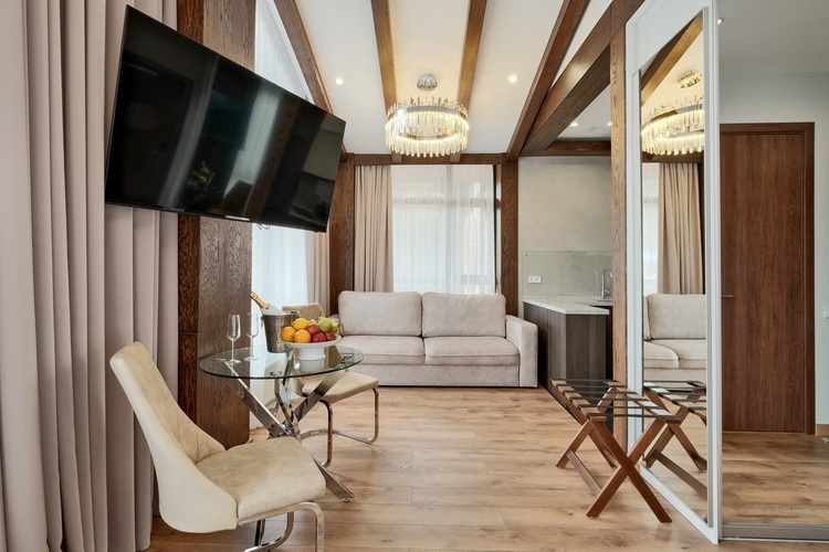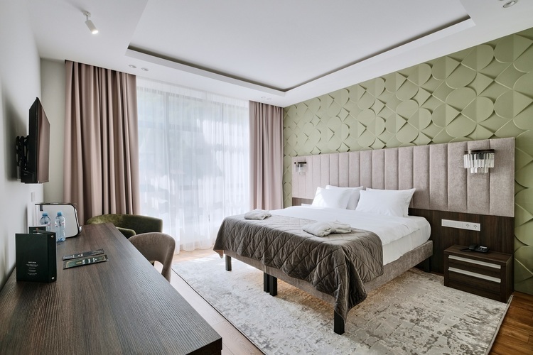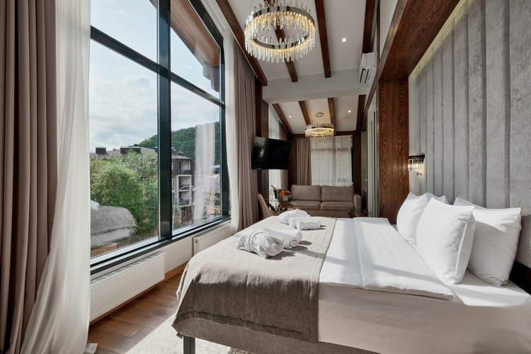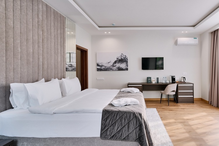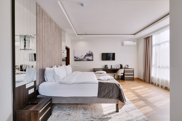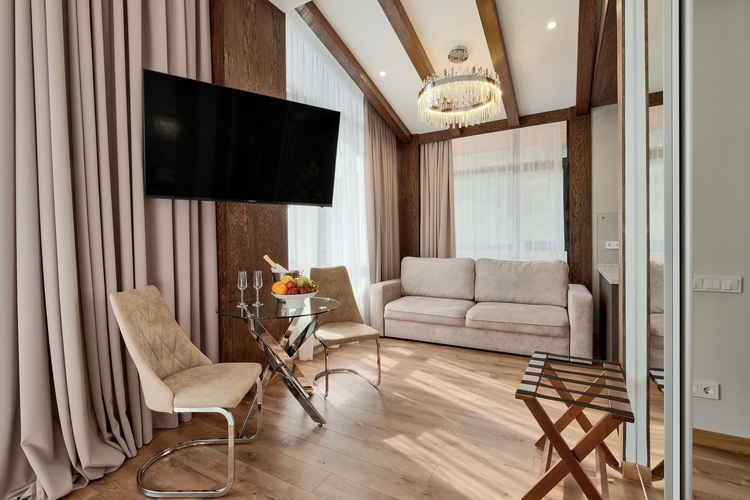 Номер находится в новом 3 корпусе отеля. Просторный номер класса Люкс с гармоничным дизайнерским интерьером. Окна номера открывают завораживающую панораму гор. Номер разделен на несколько зон: спальня и гостиная с кухонной зоной. В номере 2 дополнительных места на удобном диване. Номер без балкона. Для удобства гостей в номере есть всё необходимое для полноценного отдыха: обеденная зона, кондиционер, холодильник, плазменный телевизор, утюг, гладильная доска, сейф.