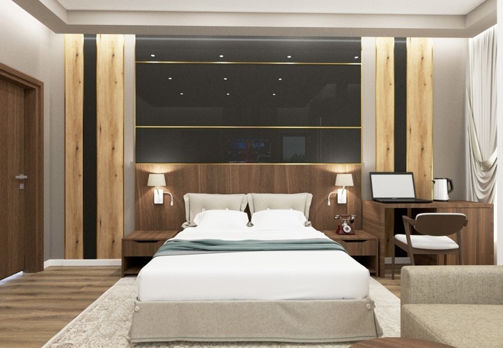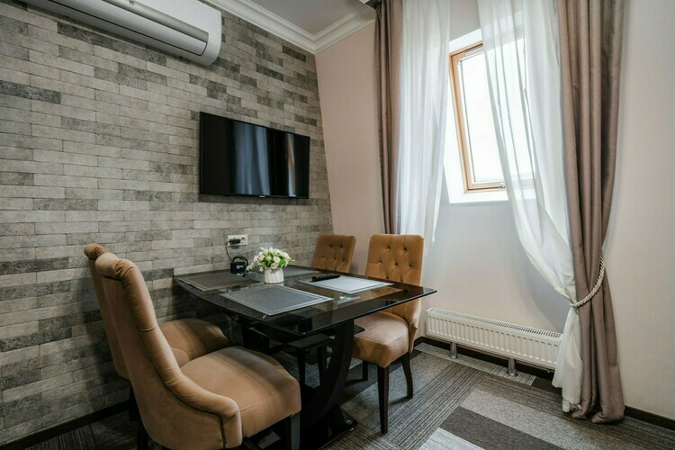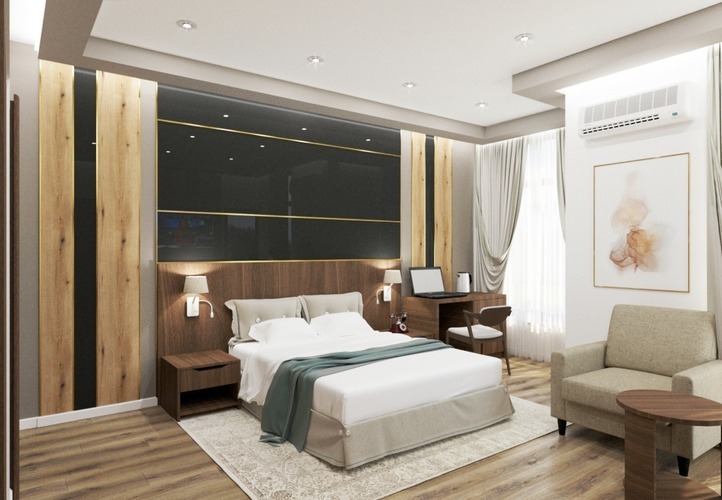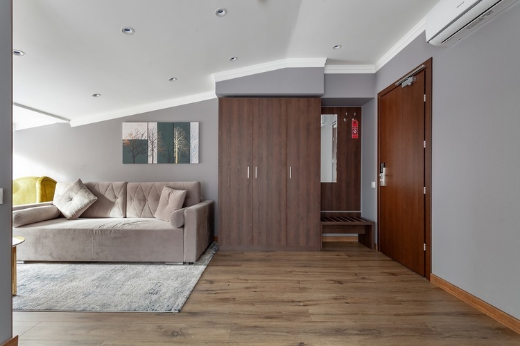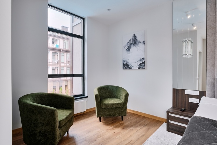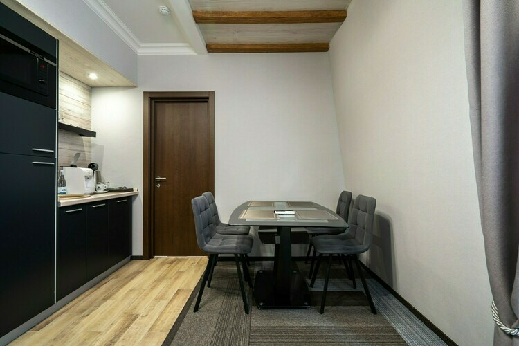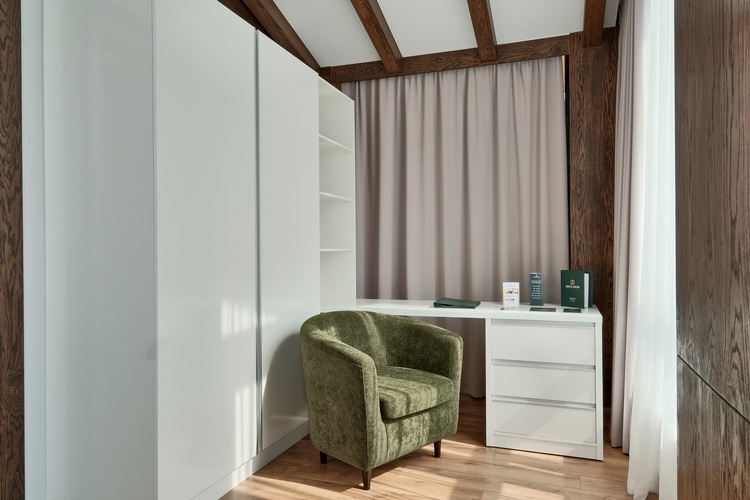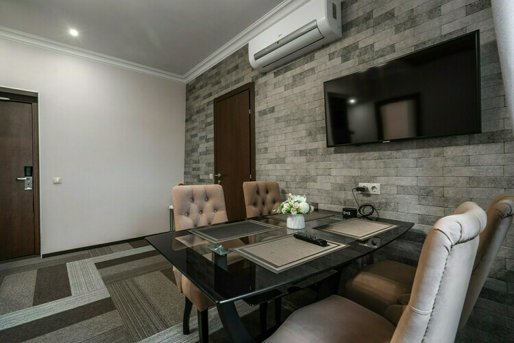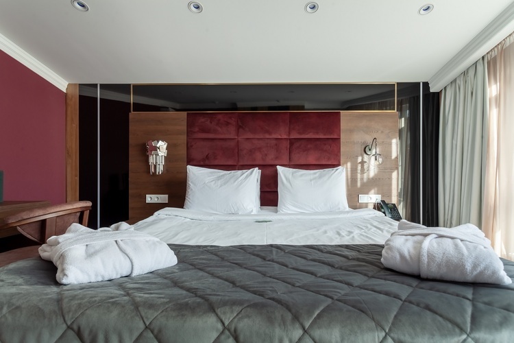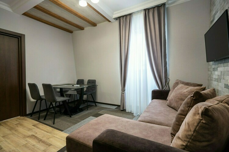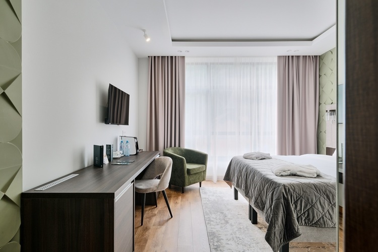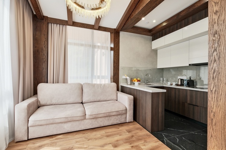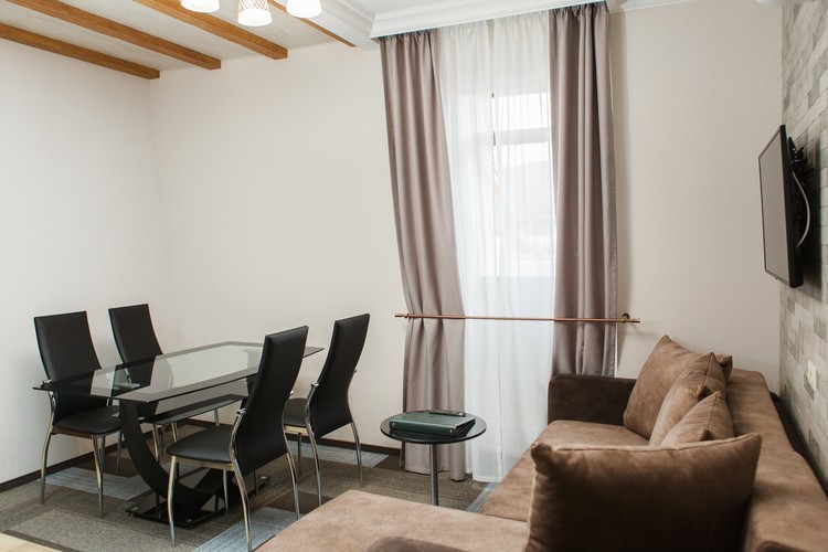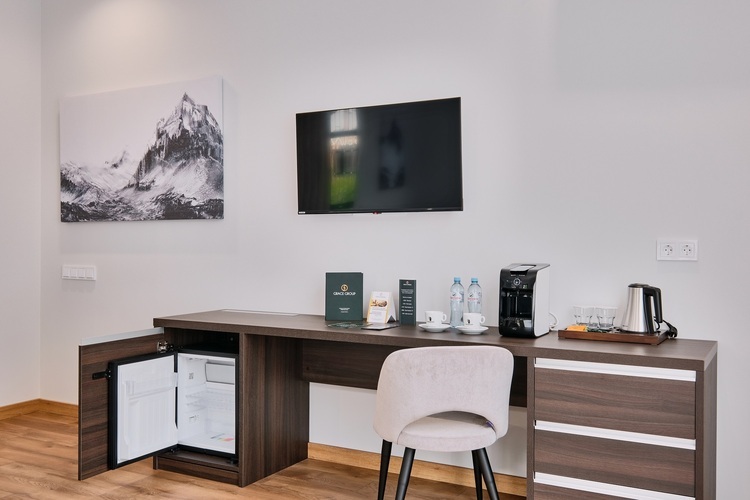Номер находится в новом 3 корпусе отеля. Просторный номер класса Люкс с гармоничным дизайнерским интерьером. Окна номера открывают завораживающую панораму гор. Номер разделен на несколько зон: спальня и гостиная с кухонной зоной. В номере 2 дополнительных места на удобном диване. Номер без балкона. Для удобства гостей в номере есть всё необходимое для полноценного отдыха: обеденная зона, кондиционер, холодильник, плазменный телевизор, утюг, гладильная доска, сейф.