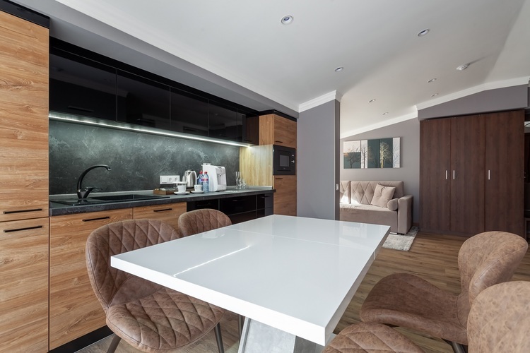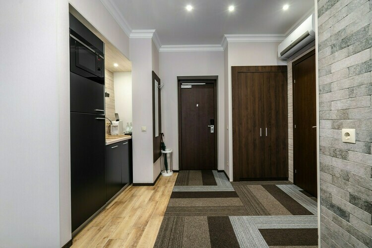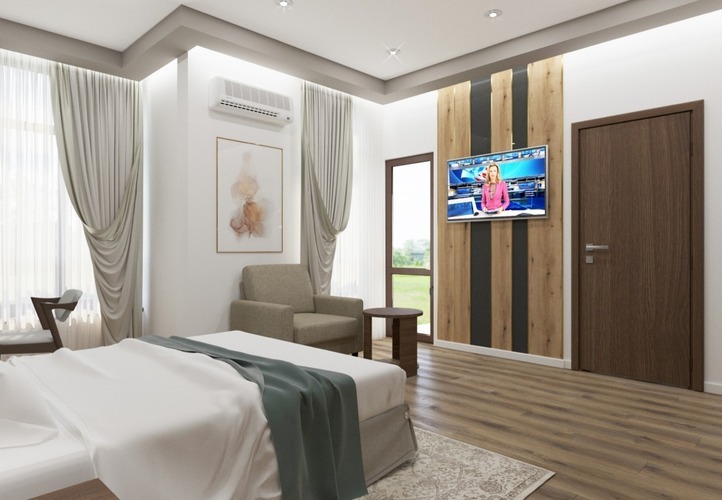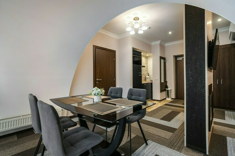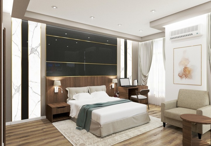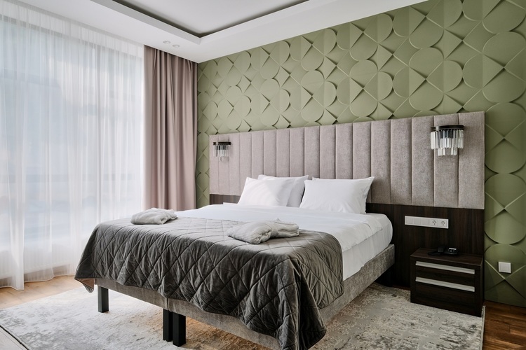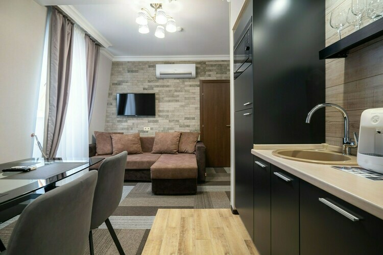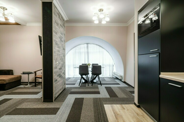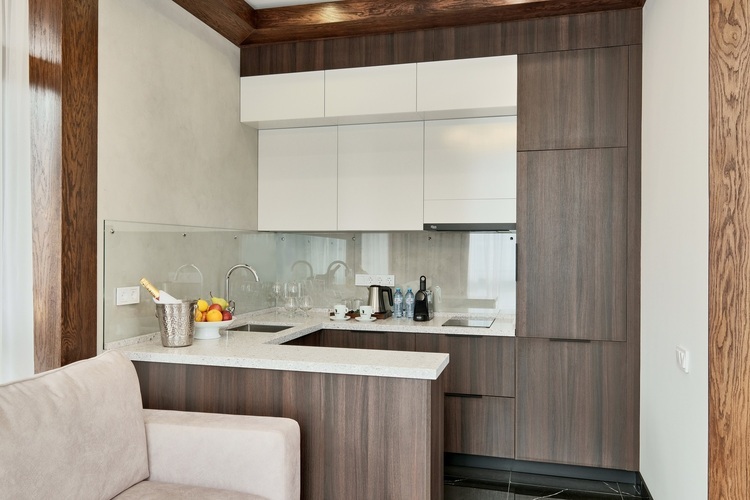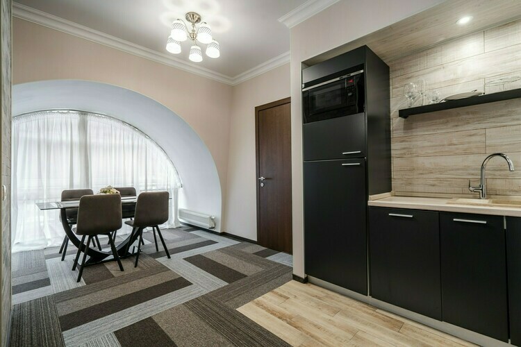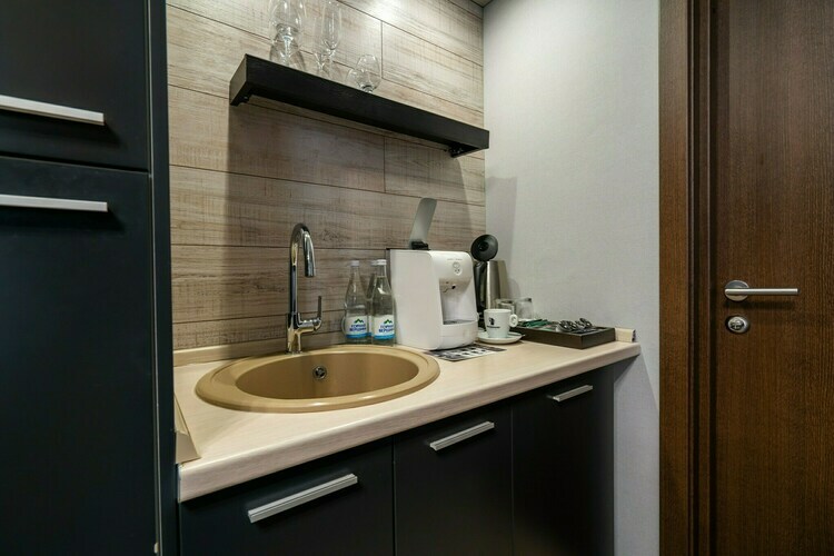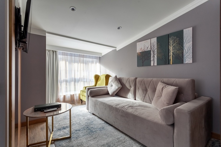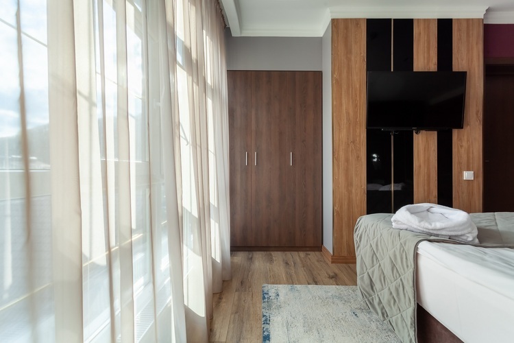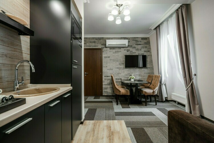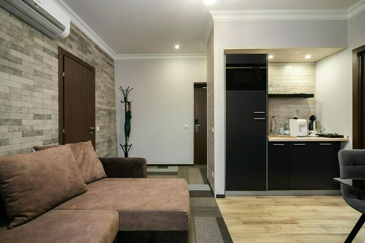 Номер находится в новом 3 корпусе отеля. Просторный номер класса Люкс с гармоничным дизайнерским интерьером. Окна номера открывают завораживающую панораму гор. Номер разделен на несколько зон: спальня и гостиная с кухонной зоной. В номере 2 дополнительных места на удобном диване. Номер без балкона. Для удобства гостей в номере есть всё необходимое для полноценного отдыха: обеденная зона, кондиционер, холодильник, плазменный телевизор, утюг, гладильная доска, сейф.