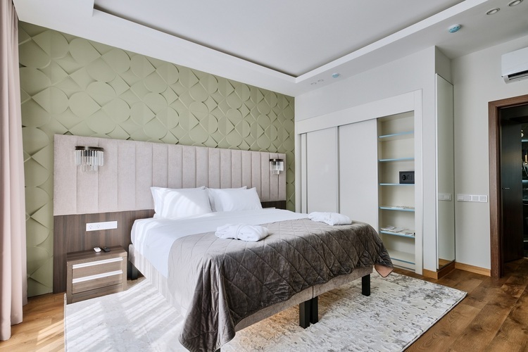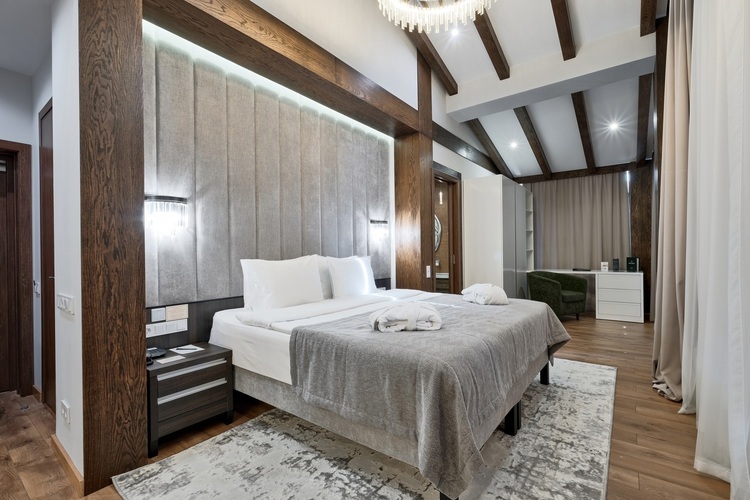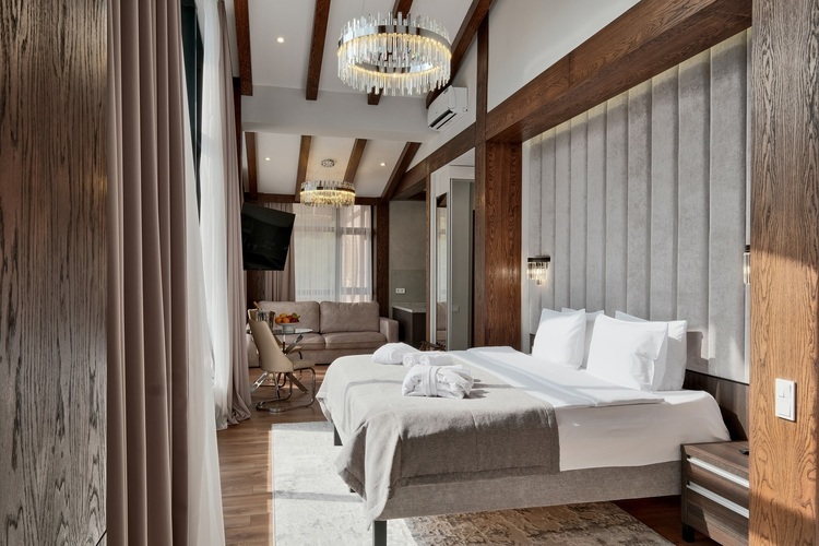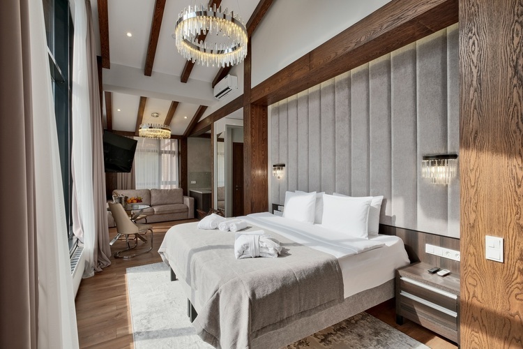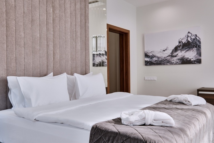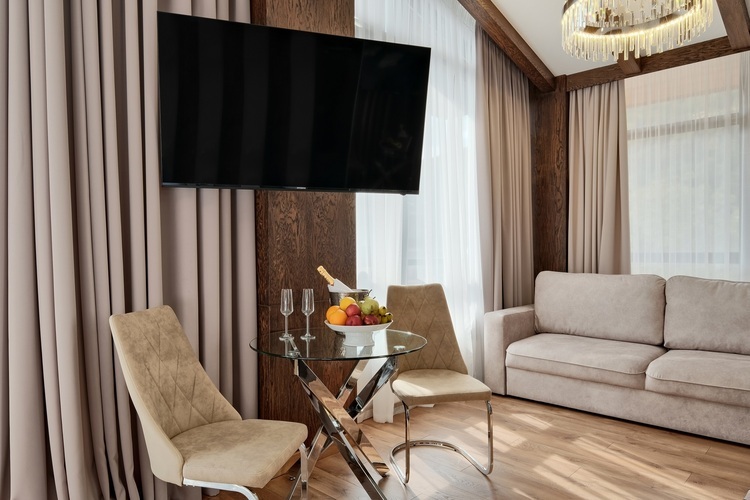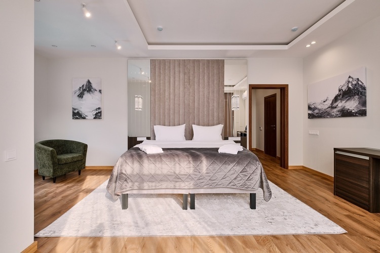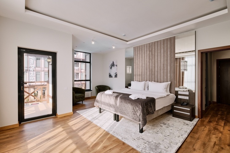 Номер класса «Премиум люкс» – это по-настоящему шикарные апартаменты, рассчитанные на самых взыскательных наших гостей. Вас ждет просторный двухкомнатный номер с гармоничным, стильным, безупречно выдержанным интерьером. Окна номера открывают завораживающую панораму гор, а на балконе Вы сможете вдохнуть чистый горный воздух. Внутреннее пространство номера разделено на несколько функциональных зон, в каждой из которых Вы найдете всё необходимое. Комфортная двуспальная кровать и дополнительные спал