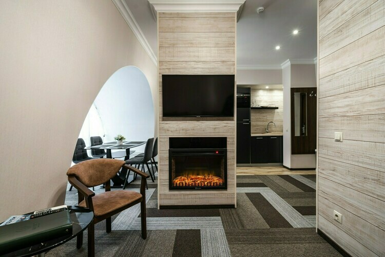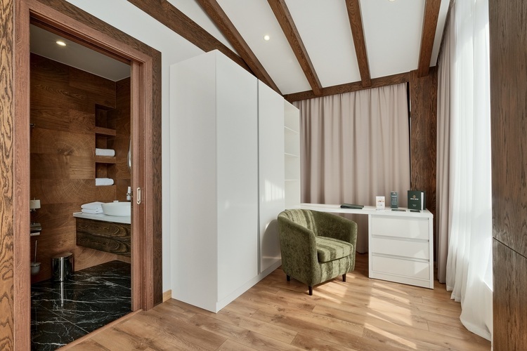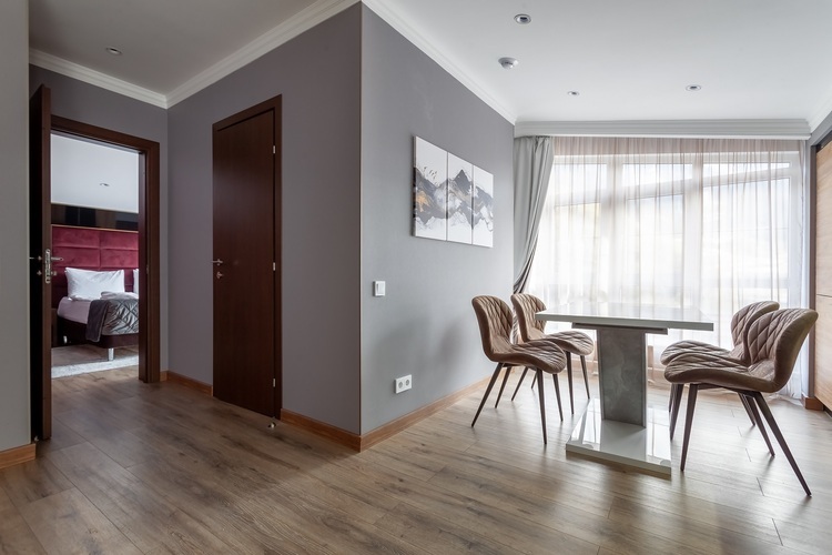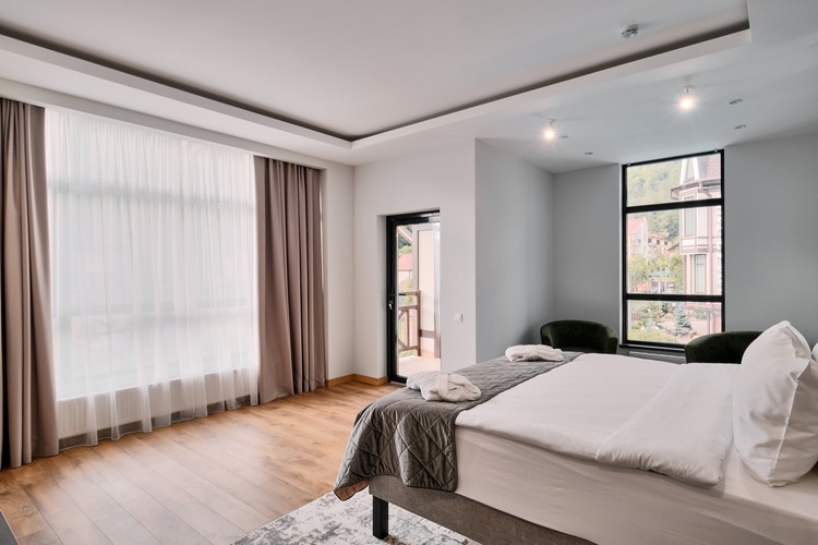 Номер класса « Люкс без балкона» – это шикарные апартаменты, рассчитанные на самых взыскательных гостей. Вас ждет просторный двухкомнатный номер с гармоничным, стильным, безупречно выдержанным интерьером. Окна номера открывают завораживающую панораму гор. Внутреннее пространство номера разделено на несколько функциональных зон, в каждой из которых Вы найдете всё необходимое.