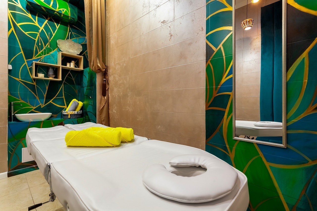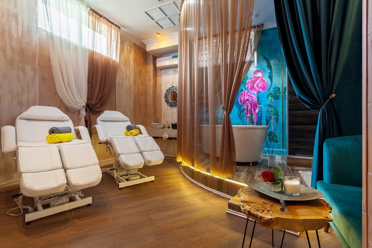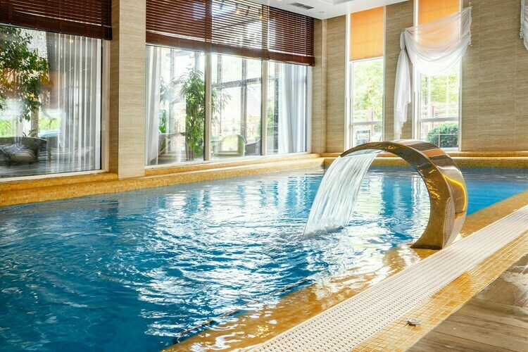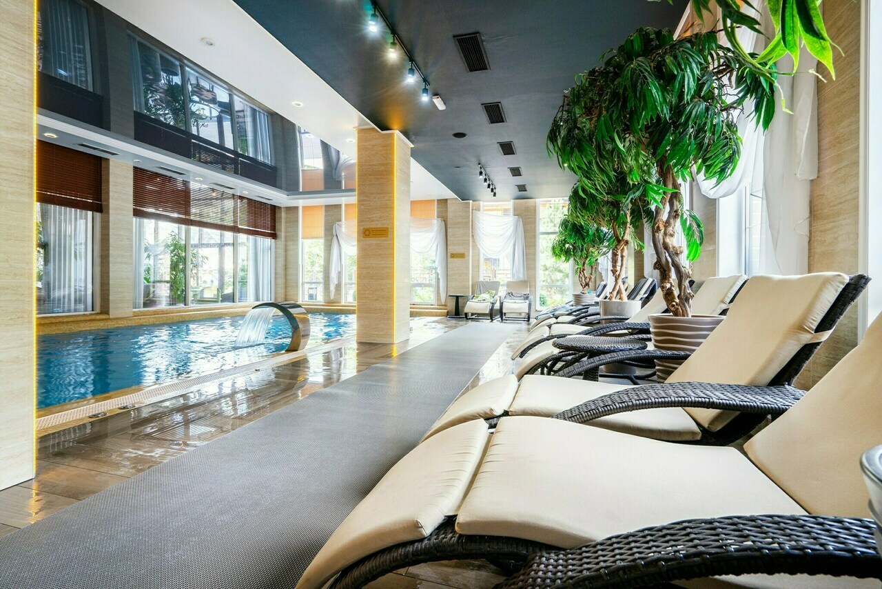 СПА-процедуры, оздоровительные массажи, «классическую» финскую сауну и турецкий хаммам, крытый подогреваемый бассейн с панорамными окнами;