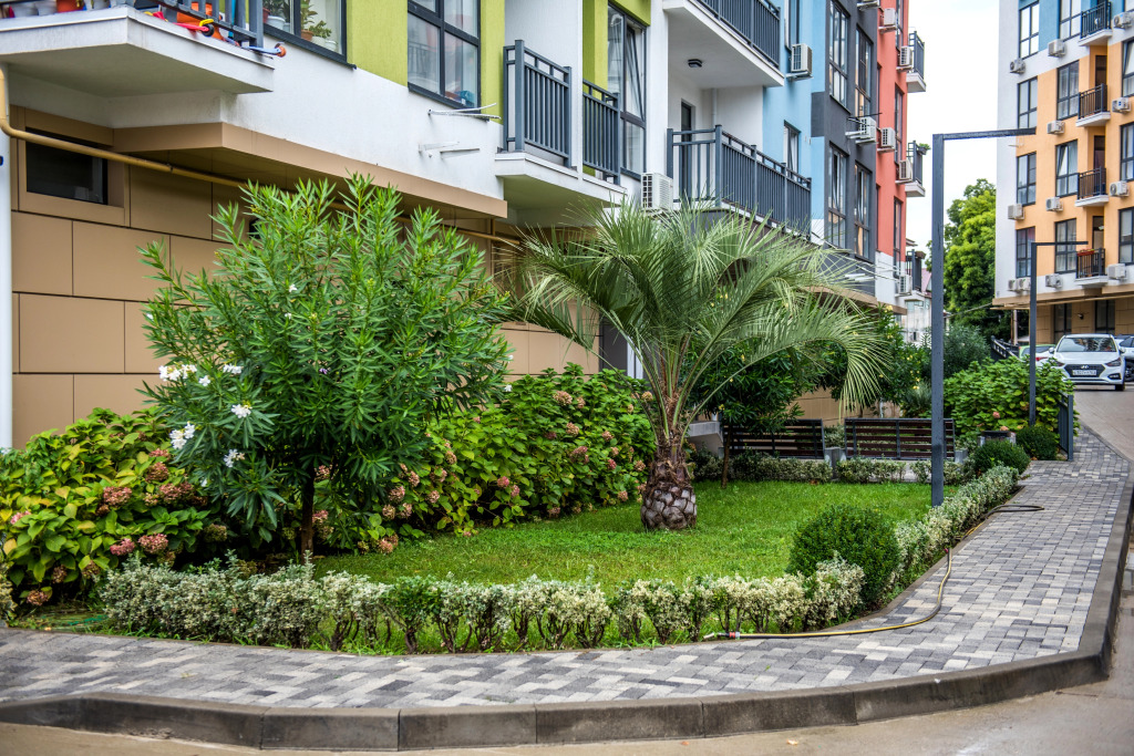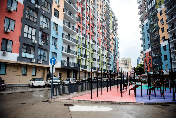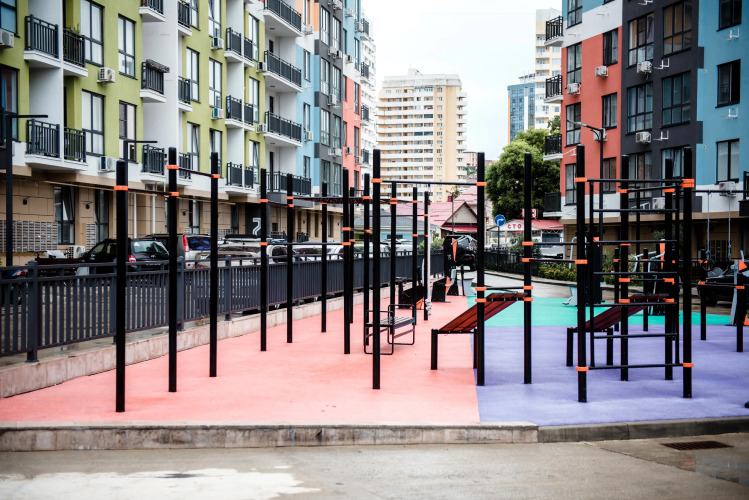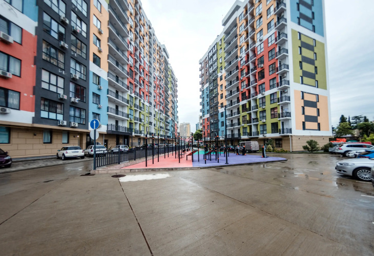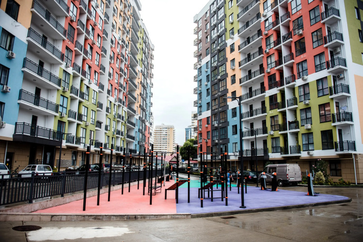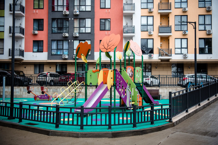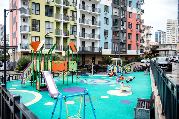 Дом находится на закрытой территории с детской площадкой и тренажёрами.