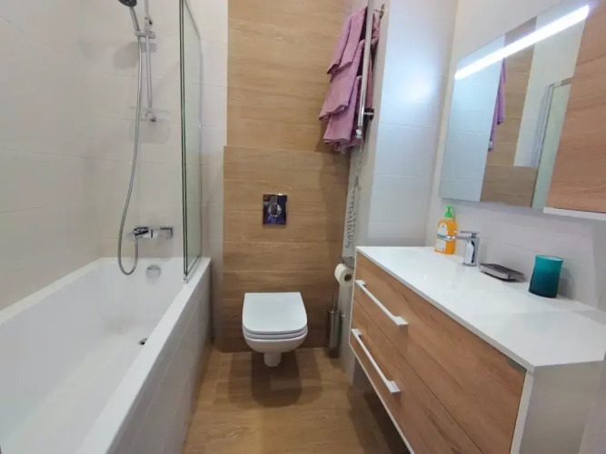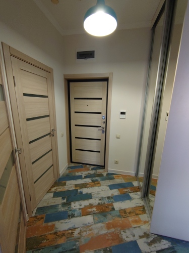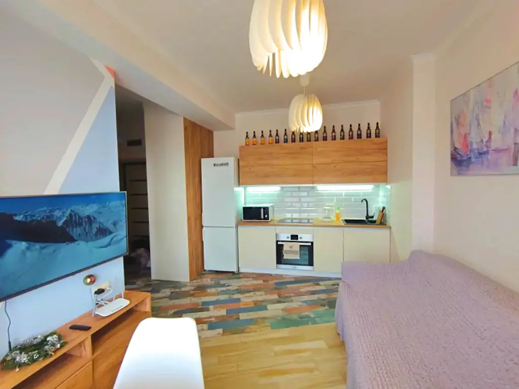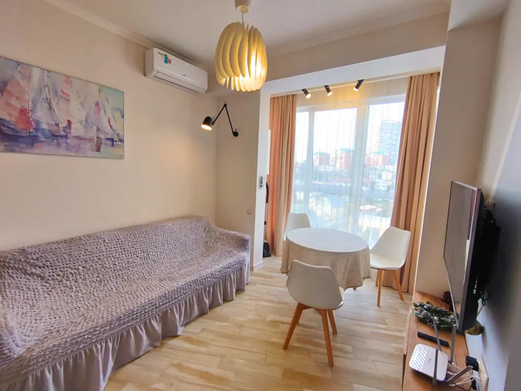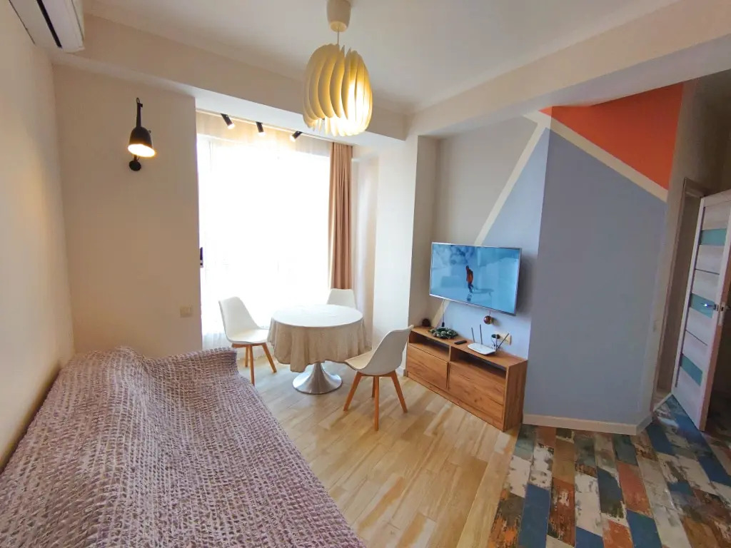 Квартира с дизайнерским интерьером имеет отдельную спальню и комнату-студию. В квартире есть необходимые предметы, от кухонных принадлежностей до посудомоечной машины. В спальной установлена кровать 180х200 с ортопедическим матрасом. Комната студия оборудована раскладным диваном и телевизором. Апартаменты находятся в доме с закрытым двором.