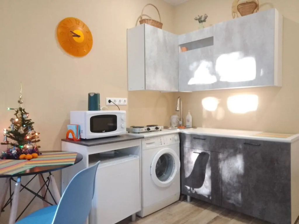 В распоряжении гостей: бытовая техника (стиральная машина и средства для стирки, холодильник, плита электрическая, микроволновая печь, телевизор, утюг), двуспальная кровать с постельным бельём, кресло-кровать (80 см), которое можно разложить в полноценное односпальное место, гигиенические принадлежности (махровые полотенца). Кухонная зона укомплектована посудой для приготовления и употребления пищи. На полке кухонного шкафа всегда имеется кофе, чай, подсолнечное масло.