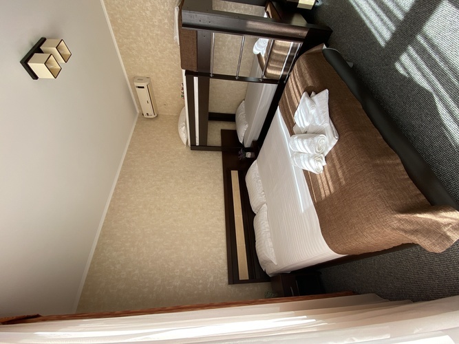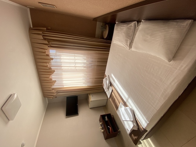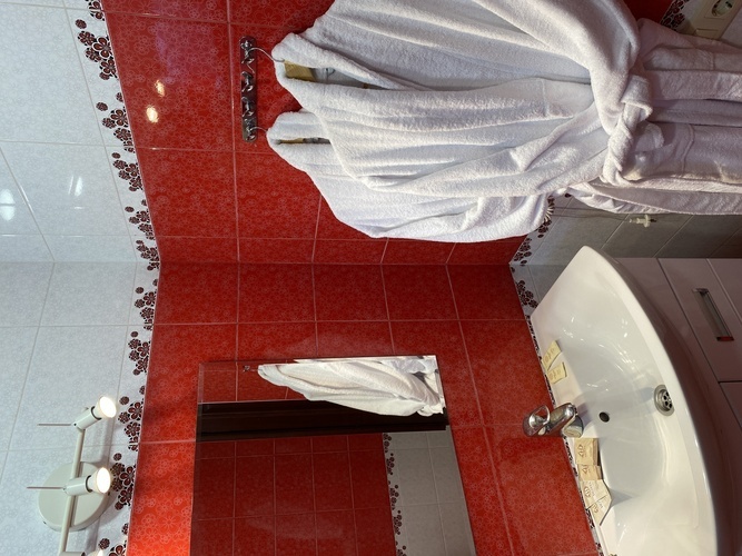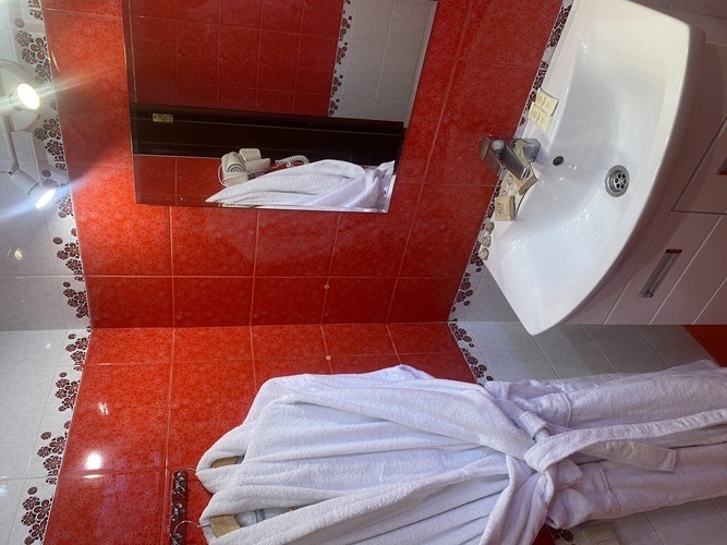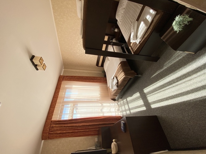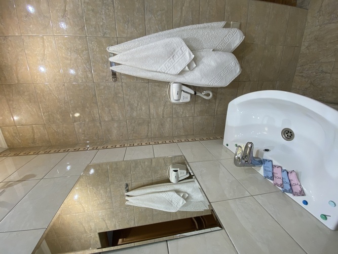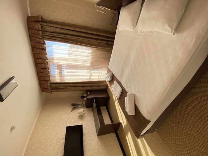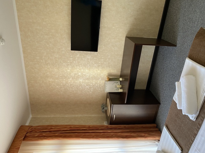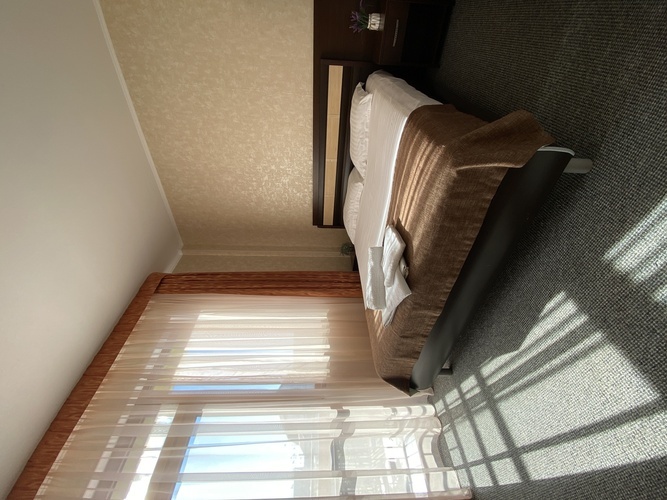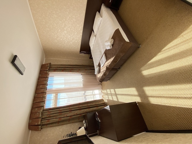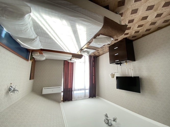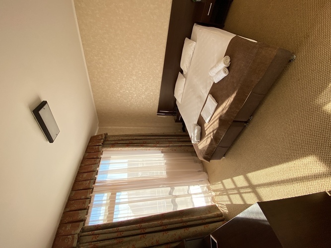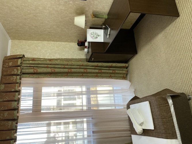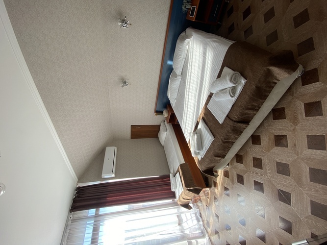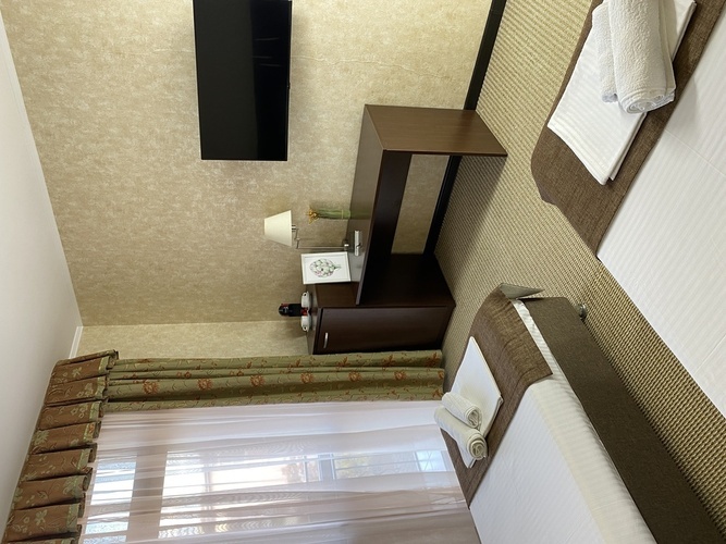 Комфортный номер, площадью 22 кв метра. В номере 2-х спальная кровать, заправленная чистым постельным бельем. Для вашего удобства: холодильник, телевизор, письменный стол, чайник электрический, кофе-машина, кондиционер,необходимая мебель, средства для чистки обуви и одежды. Есть балкон с видом на город. В номере все удобства, каждому гостю предоставляется гигиенический набор, халат и 3 полотенца.