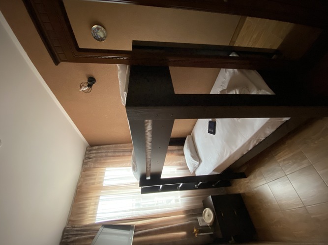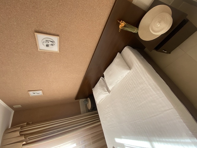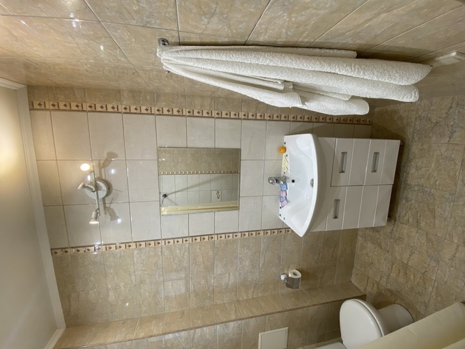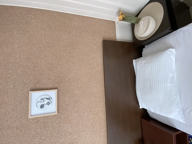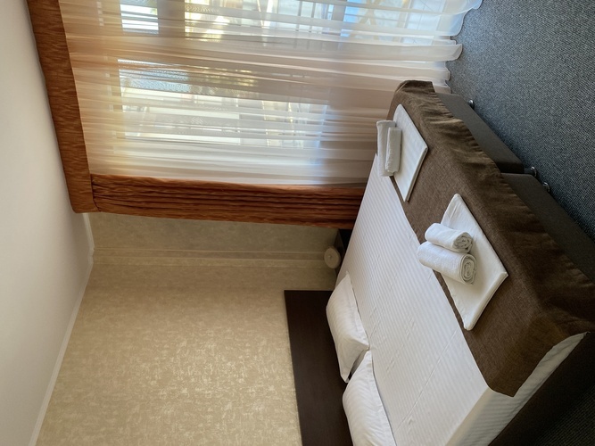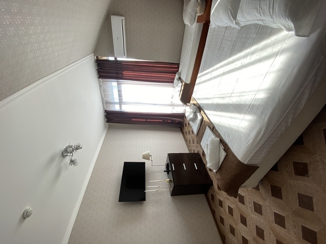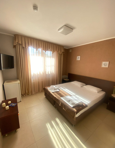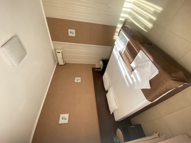 Небольшой номер площадью 20 кв метров. В номере удобная 2-х спальная кровать king size, заправленная чистым постельным бельем. Есть все для вашего удобства: холодильник, телевизор, стол, 2 стула, тумбочка, чайник электрический, кондиционер, шкаф для одежды, быстрый интернет. Удобства в номере, душ, фен, гигиенический набор и по 3 полотенца для каждого гостя