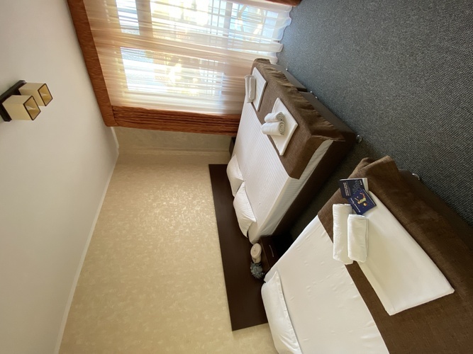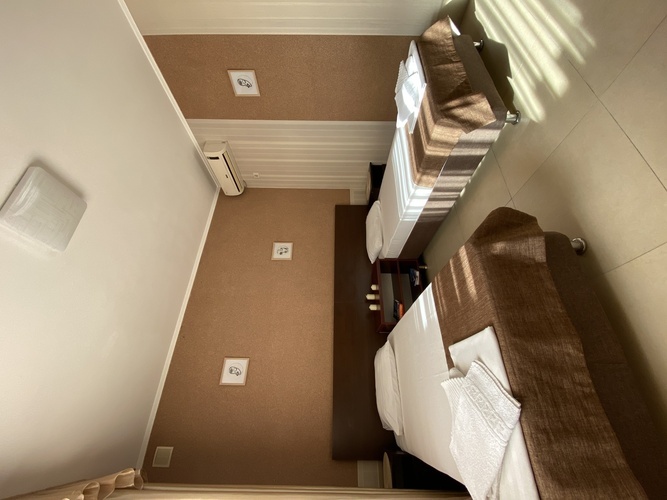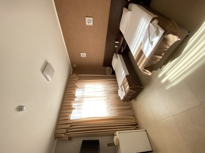 Небольшой номер площадью 20 кв метров. В номере две односпальные кровати, заправленные чистым постельным бельем. Есть все для вашего удобства: холодильник, телевизор, стол, 2 стула, тумбочка, чайник электрический, кондиционер, шкаф для одежды, быстрый интернет. Удобства в номере, душ, фен, гигиенический набор и по 3 полотенца для каждого гостя