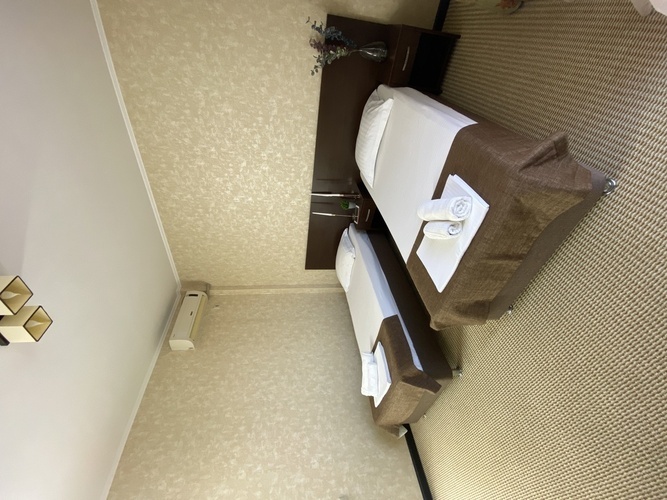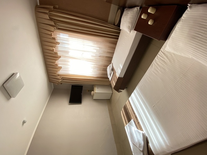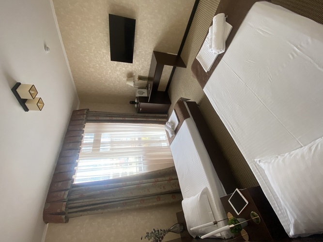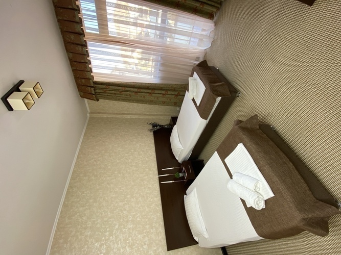 Комфортный номер, площадью 22 кв метра. В номере две односпальные кровати, заправленная чистым постельным бельем. Для вашего удобства: холодильник, телевизор, письменный стол, чайник электрический, кофе-машина, кондиционер,необходимая мебель, средства для чистки обуви и одежды. Есть балкон с видом на город. В номере все удобства, каждому гостю предоставляется гигиенический набор, халат и 3 полотенца.