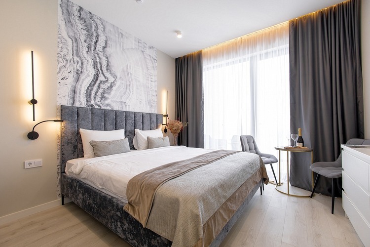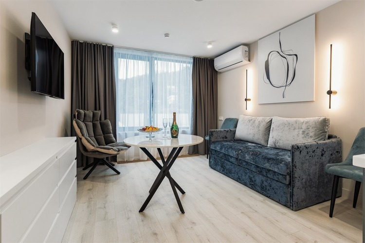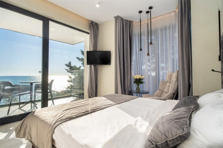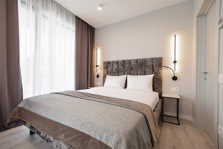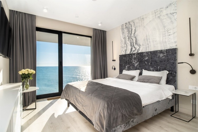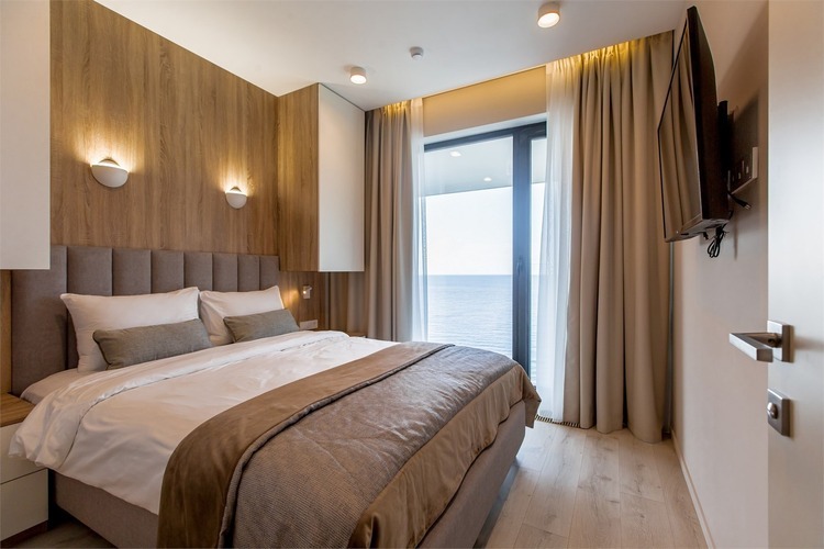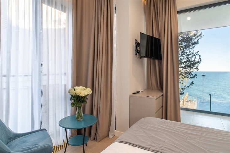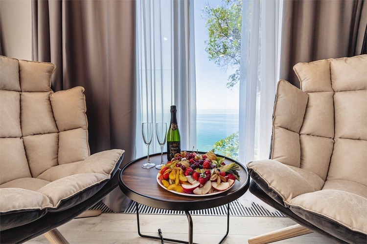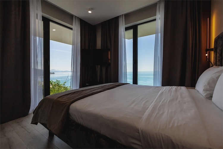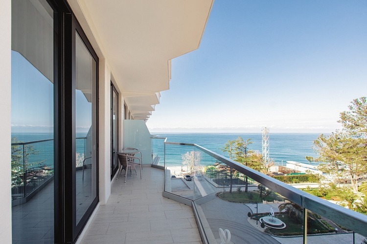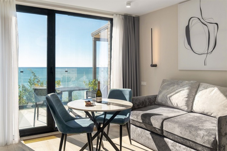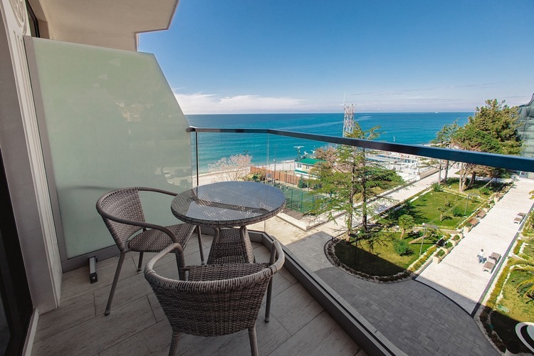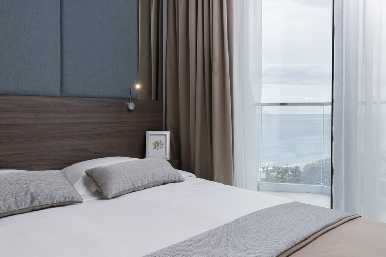 Двухкомнатные стильные апартаменты категории Делюкс, площадью 50 м2, идеально подходят для семейного размещения или отдыха повышенной комфортности. Панорамные окна и балкон, с которого открывается вид на море, создают неповторимую атмосферу и дают в полной мере насладиться отдыхом на побережье. Апартаменты оборудованы мини-кухней, бытовой техникой, комплектом посуды, чайным набором. К услугам гостей халаты, тапочки, пляжные полотенца, набор гигиенических принадлежностей
