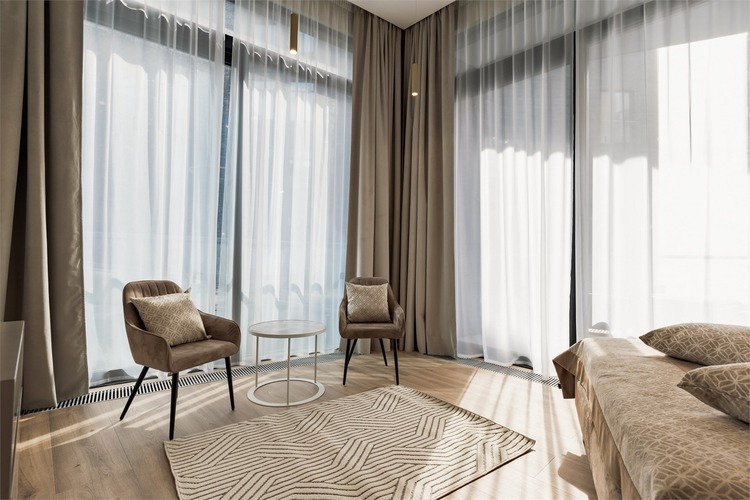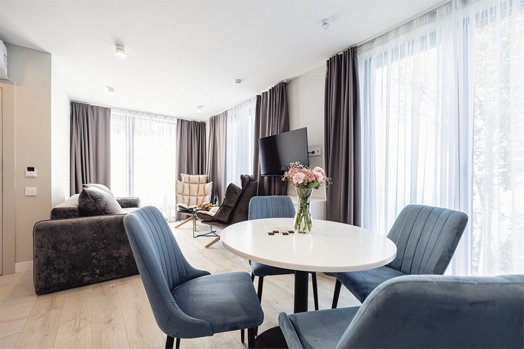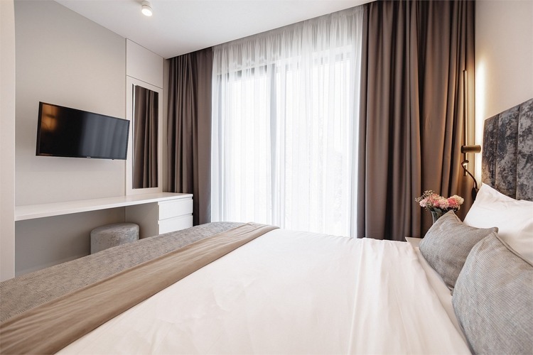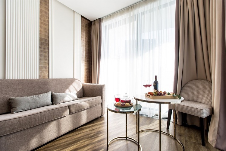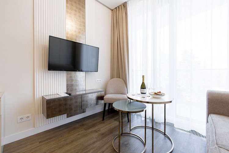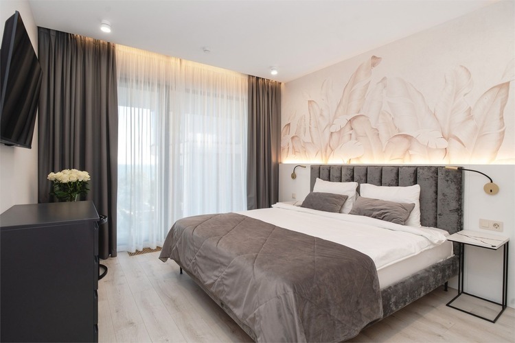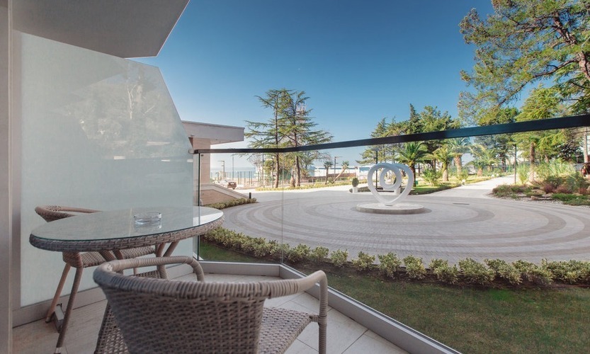 Двухкомнатные стильные апартаменты категории Делюкс, площадью 50 м2, идеально подходят для семейного размещения или отдыха повышенной комфортности. Все номера располагают панорамными окнами и просторным балконом с видом на парковую территорию*. Апартаменты оборудованы мини-кухней, бытовой техникой, комплектом посуды, чайным набором. К услугам гостей халаты, тапочки, пляжные полотенца, набор гигиенических принадлежностей, а также утюг и гладильная доска по запросу. В номерах отелях, как и на всей