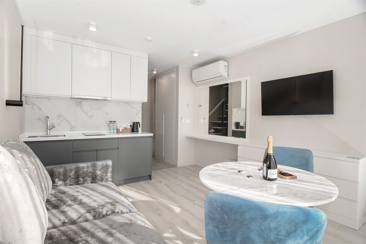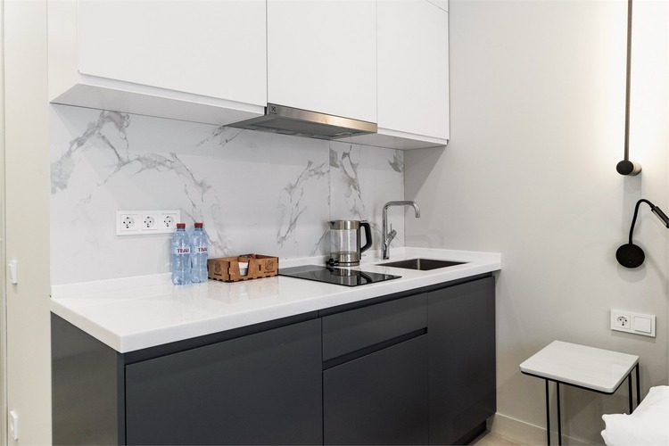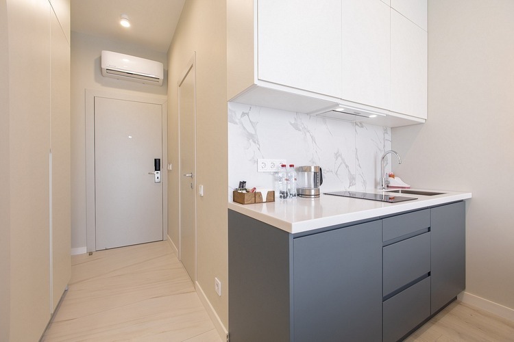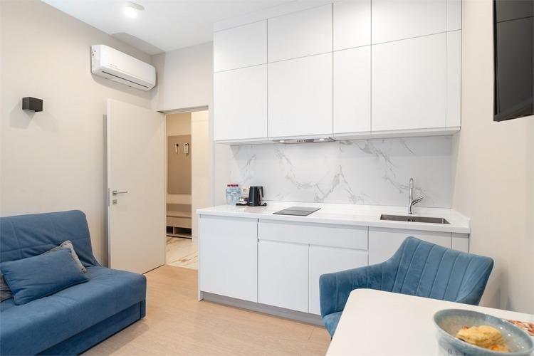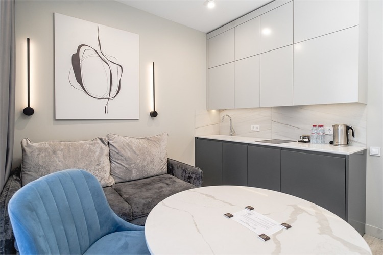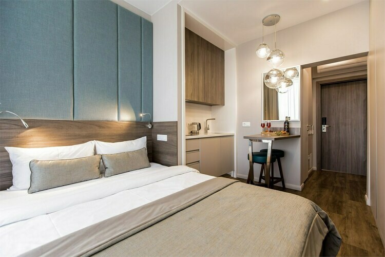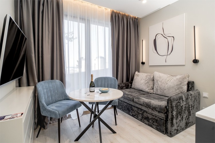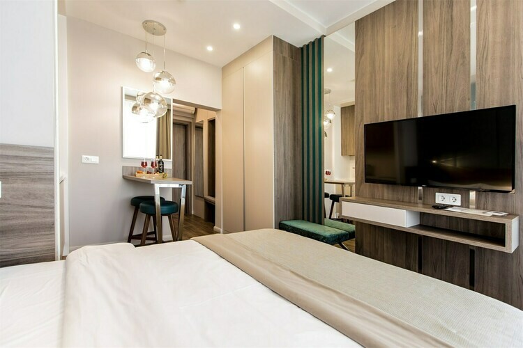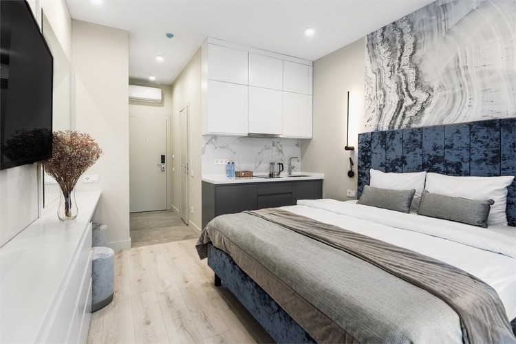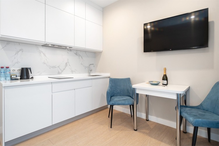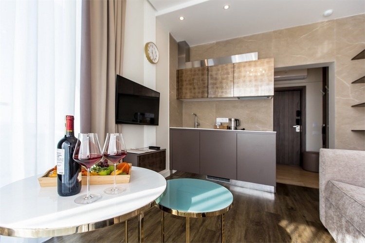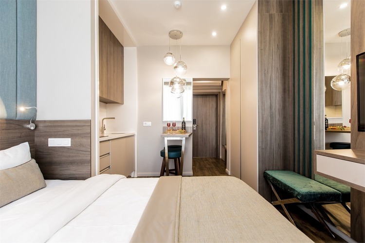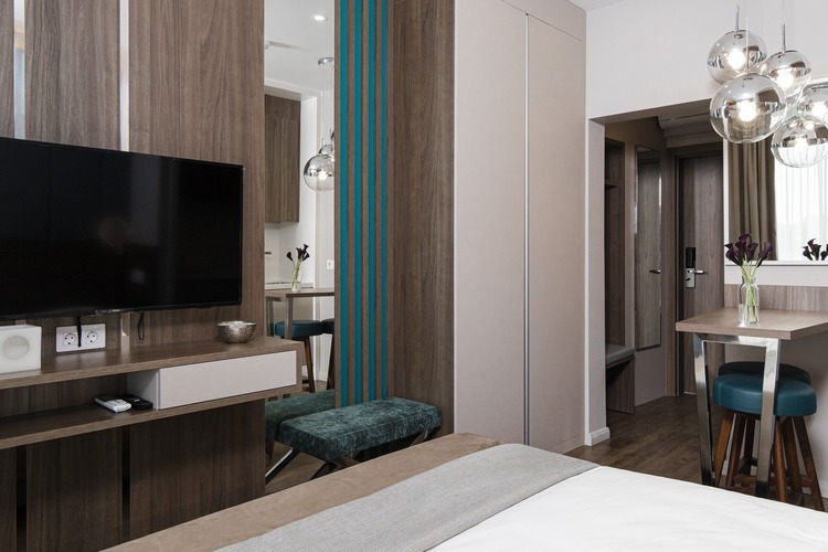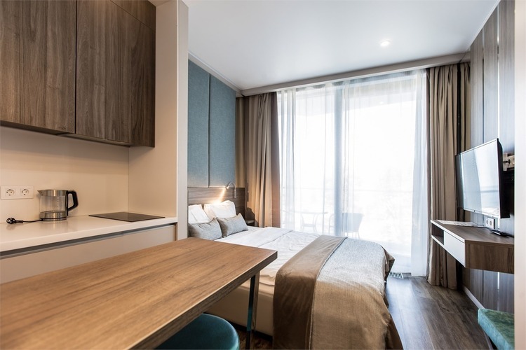 Стильные однокомнатные апартаменты, площадью 21 м2, отличаются современным и эргономичным дизайном. Номера категории Студия располагаются в разных корпусах отеля, конкретный корпус не гарантируется. Номера оснащены мини-кухней, бытовой техникой, комплектом посуды, чайным набором. К услугам гостей халаты, тапочки, пляжные полотенца, набор гигиенических принадлежностей, а также утюг и гладильная доска по запросу. В номерах отелях, как и на всей территории, доступен высокоскоростной Wi-Fi.