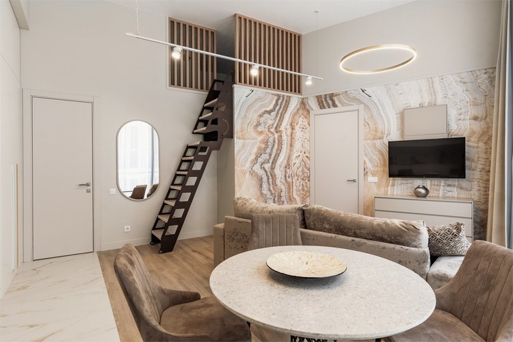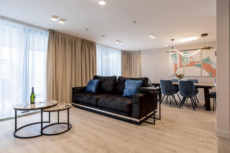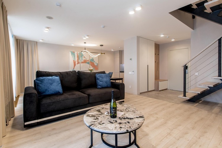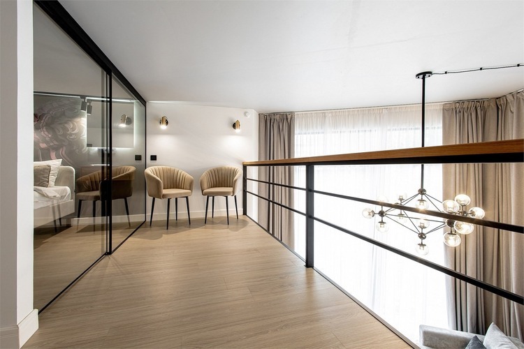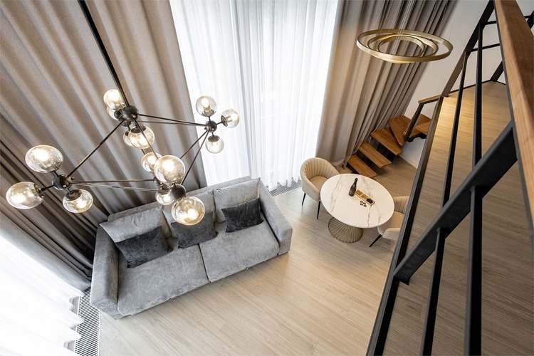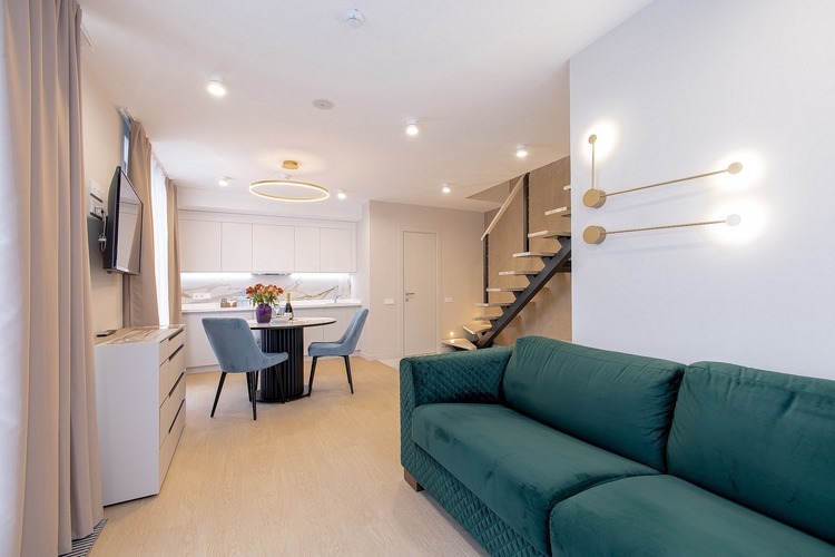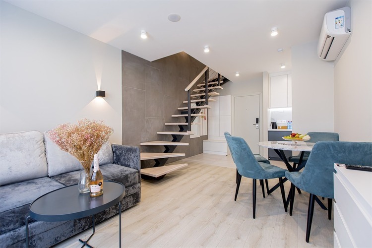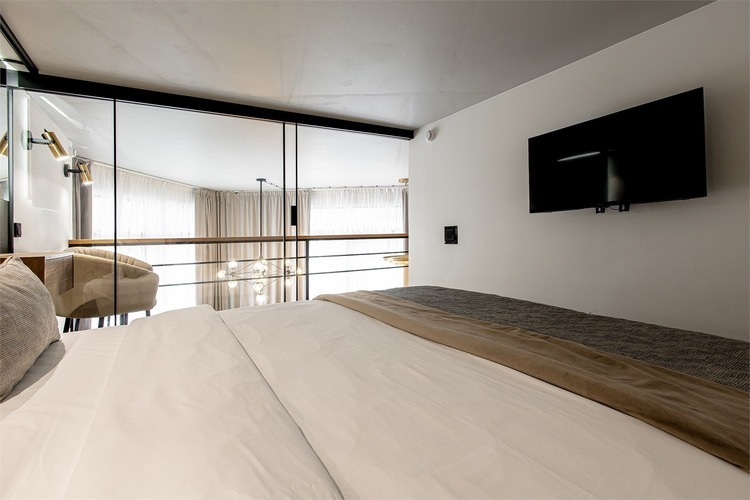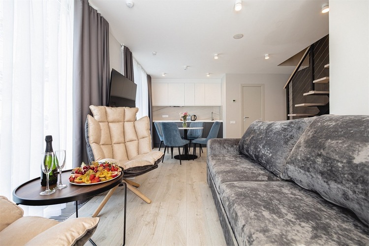 вухэтажные стильные апартаменты категории Дуплекс джуниор, площадью 50 м2, идеально подходят для семейного размещения или отдыха повышенной комфортности. Панорамные окна и балкон, создают неповторимую атмосферу. Обращаем Ваше внимание, высота потолков на втором этаже 190 см. Номера включают максимум 4х взрослых + дополнительно можно разместить ребёнка (0-7 лет), без предоставления спального места. В номере одна кровать «Queen size»160 см*200 см., и один «Диван-кровать» 140*180