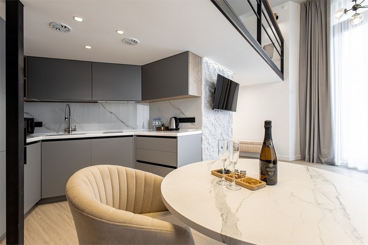 Двухкомнатный апартамент категории Люкс отличается уникальным дизайном и стильным интерьером и идеально подходит для семейного пребывания и ценителей повышенного комфорта.В номере гостей ожидают спальня с двуспальной кроватью «Queen size», гостиная с мини-кухней, обеденным столом и стульями, зоной отдыха с раскладным диваном и радость для ребенка - спальня-чердак. Панорамные окна, высокие потолки, оригинальная дизайнерская отделка дарят особое ощущение комфорта и создают неповторимую атмосферу.