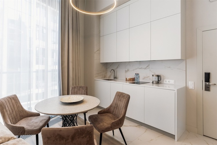 Стильные однокомнатные Студии без балкона, площадью 21 м2. Минималистичное оформление номеров в светлых тонах и панорамные окна создают располагающую к отдыху уютную атмосферу. Номера оснащены мини-кухней, бытовой техникой, комплектом посуды, чайным набором. К услугам гостей халаты, тапочки, пляжные полотенца, набор гигиенических принадлежностей, а также утюг и гладильная доска по запросу. В номерах отелях, как и на всей территории, доступен высокоскоростной Wi-Fi.